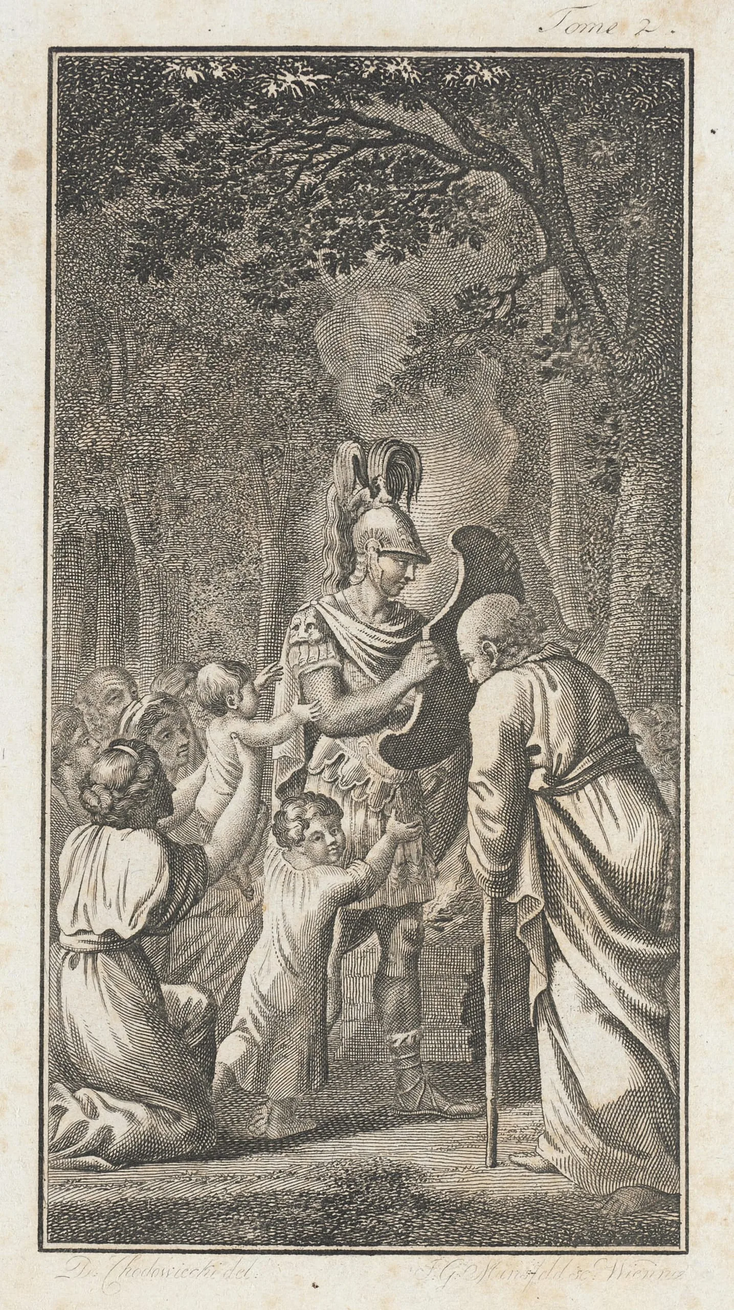 Engraving on cream paper, a helmeted soldier in classical armor surrounded by kneeling and reaching figures in a wooded setting