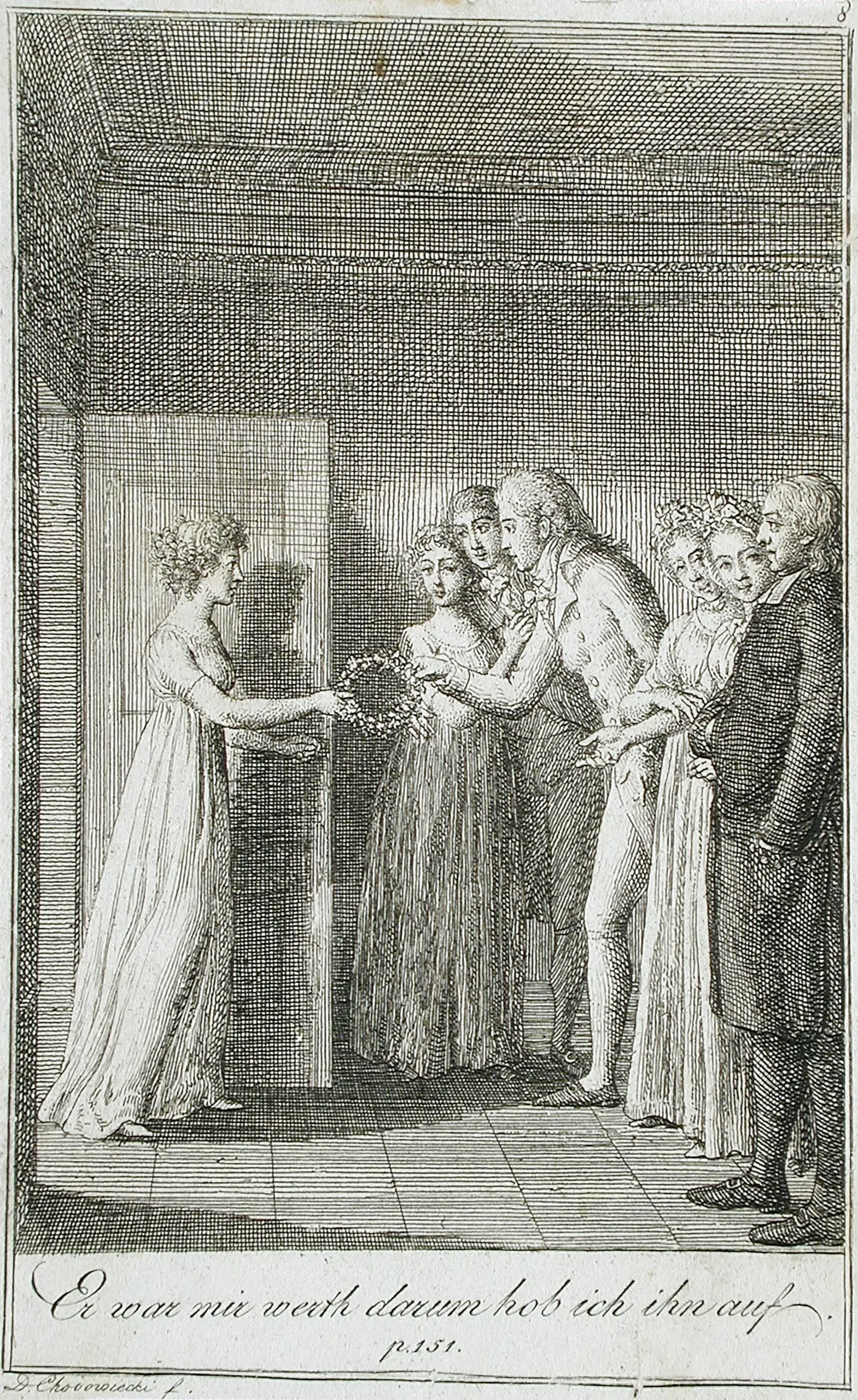 Engraving on cream paper, six figures in late 18th-century dress gathered in an interior room, one woman receiving a floral wreath from a group of five, with German text below