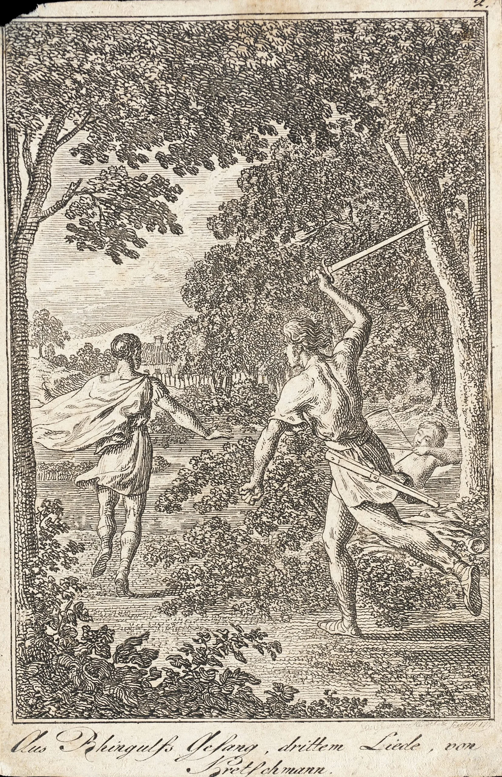 Engraving on cream paper showing three figures in a wooded landscape, one raising a long pole overhead, another in a cart, a third in a draped cloak facing away