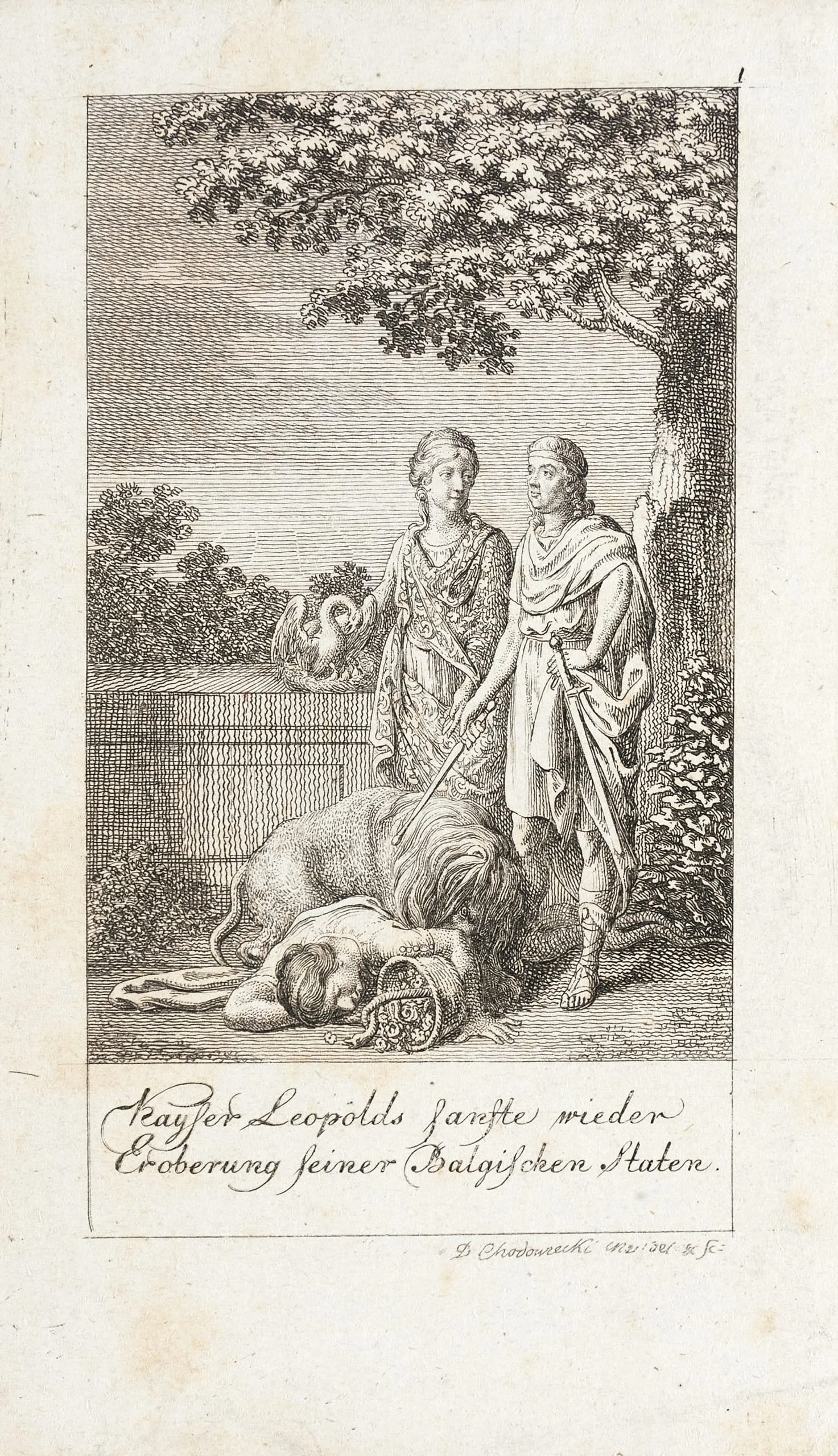 Copperplate engraving, two classically draped figures standing beside a reclining lion with a crown on the ground, garden setting with tree and ornamental fence