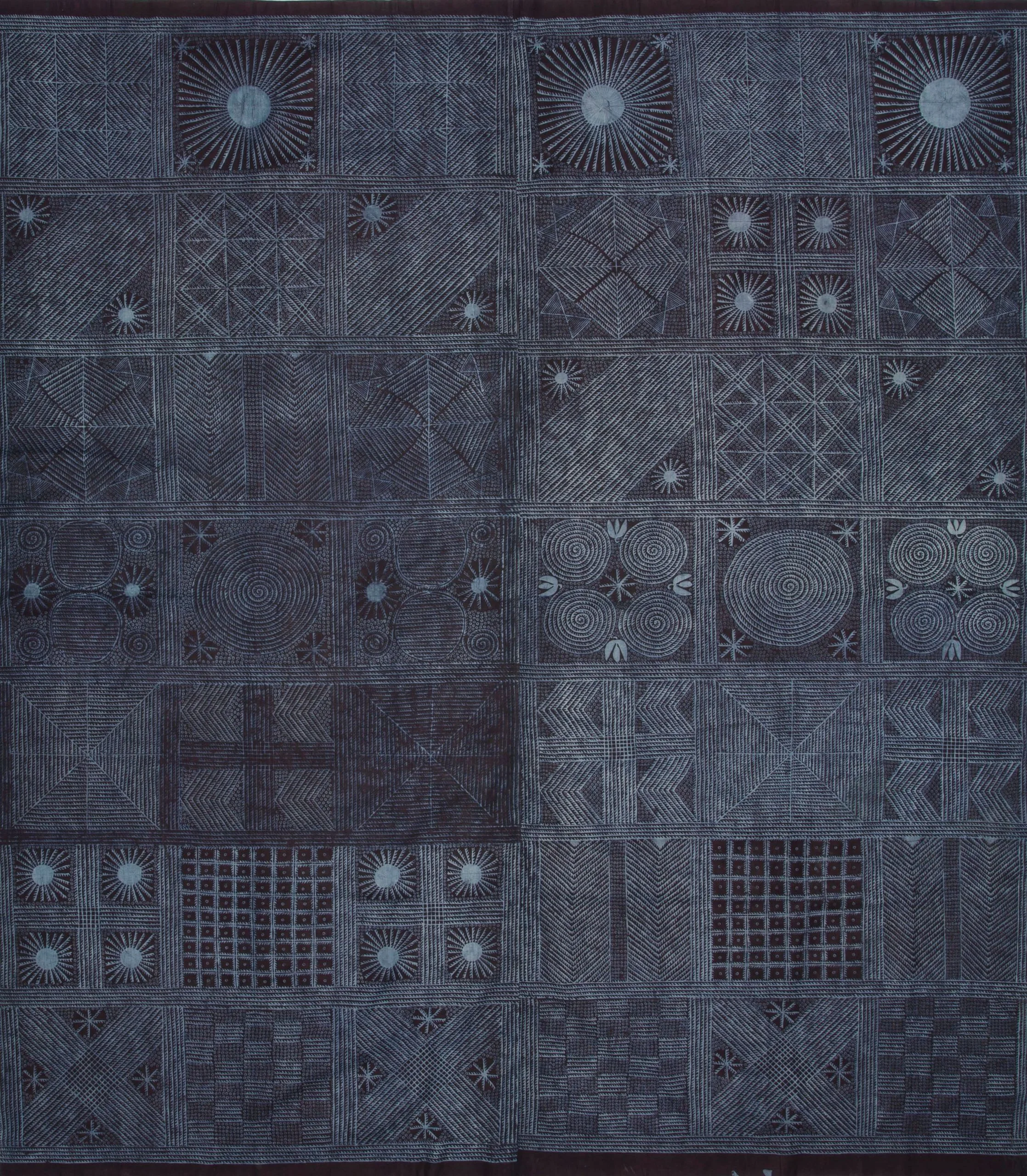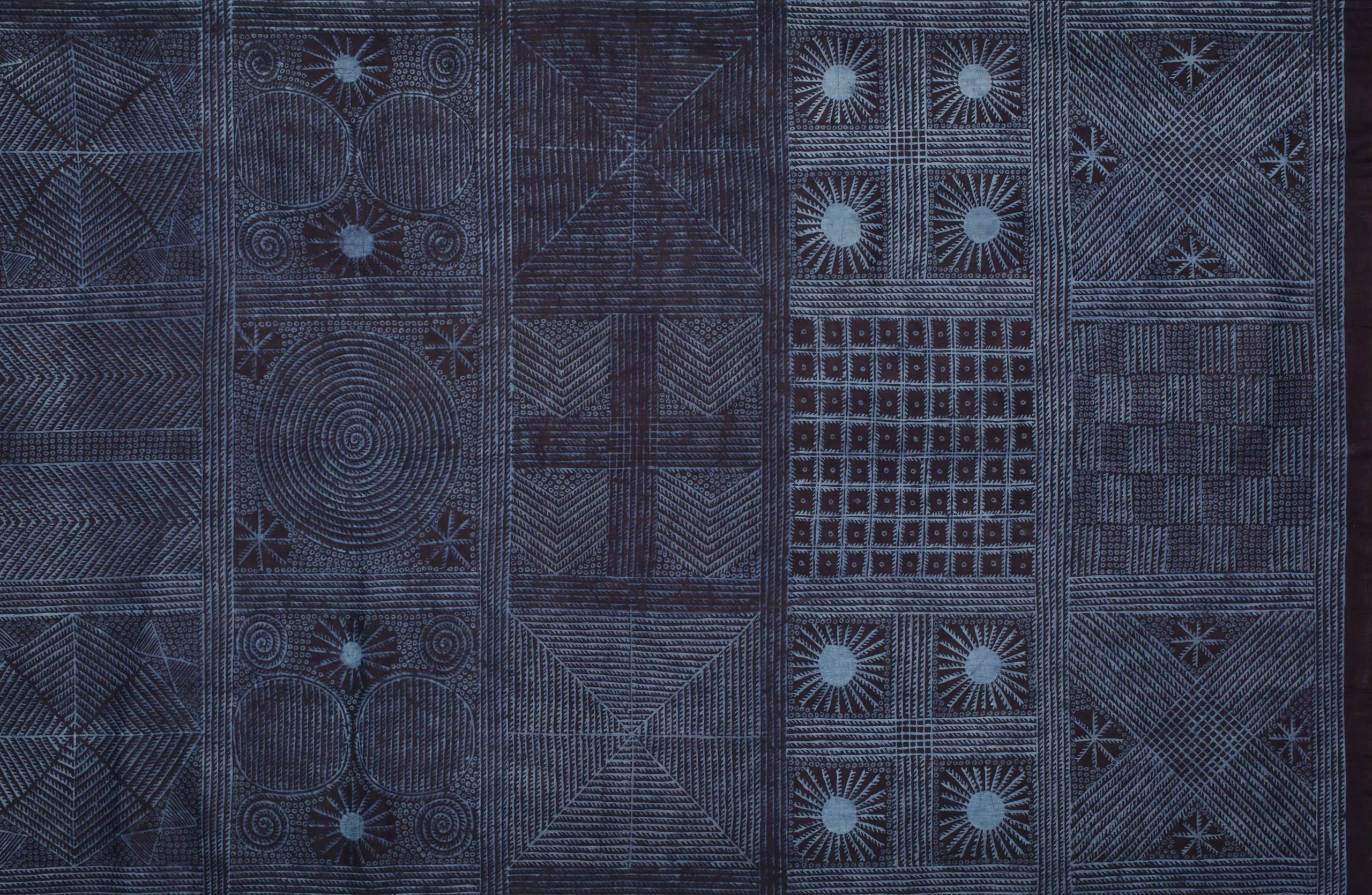 - Cotton plain weave, stenciled cassava, paste-resist dyed (adire eleko)