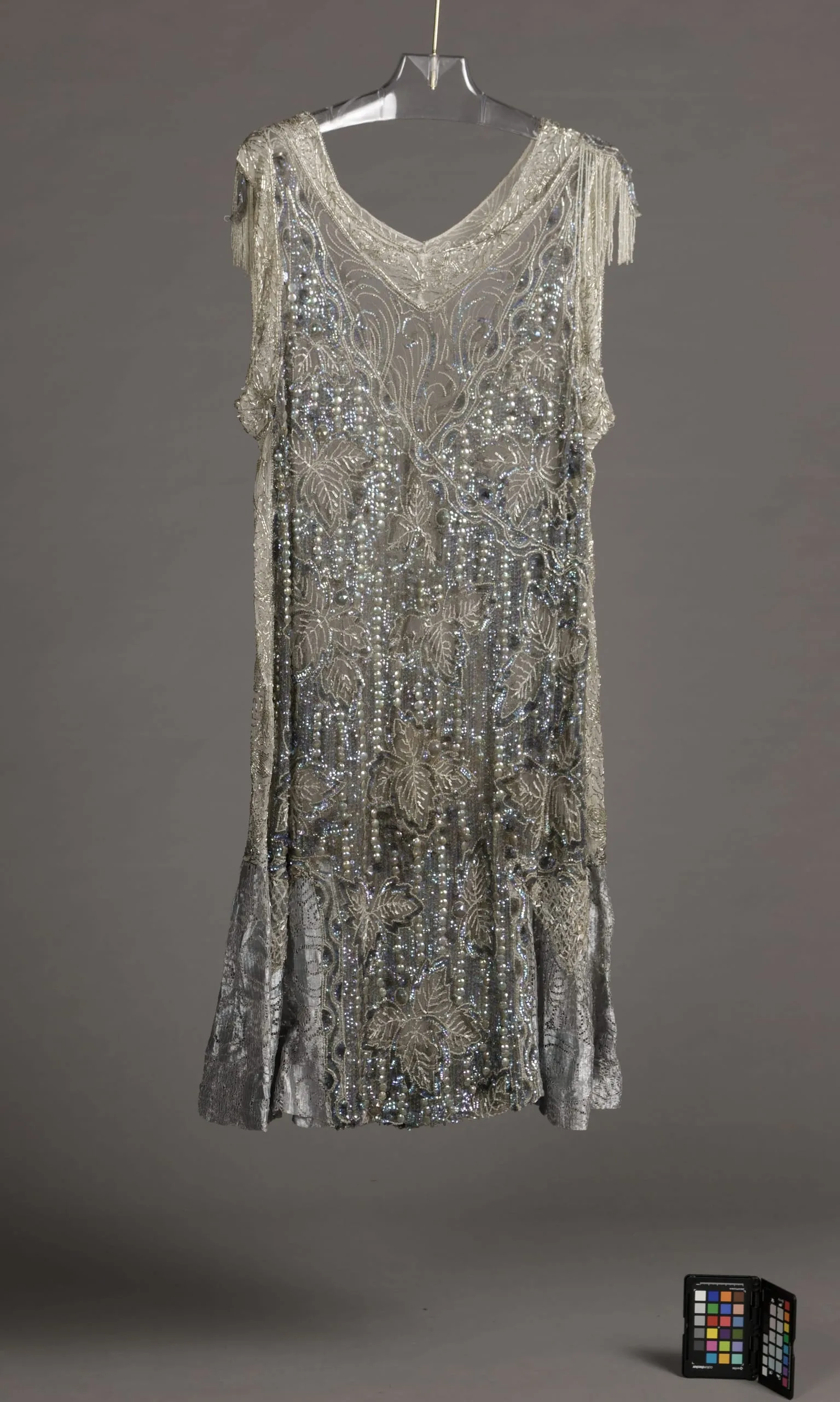 Sleeveless silver-gray evening dress on a hanger, covered in dense floral beadwork, sequins, and bead fringe at the shoulders, with a dropped-waist silhouette