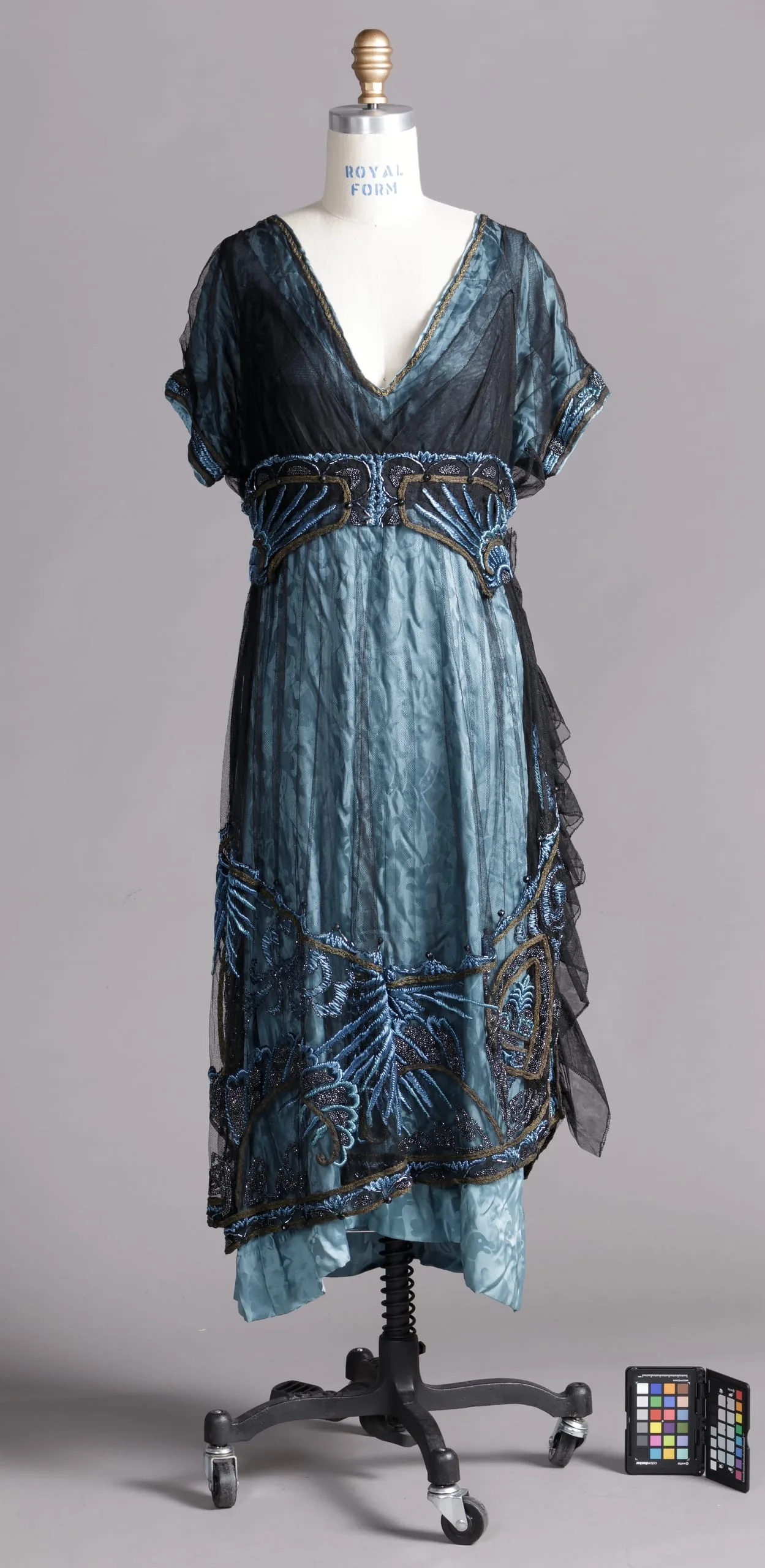 - Silk net and silk damask, with silk and metallic-thread embroidery, glass beads, metal beads, and crystals