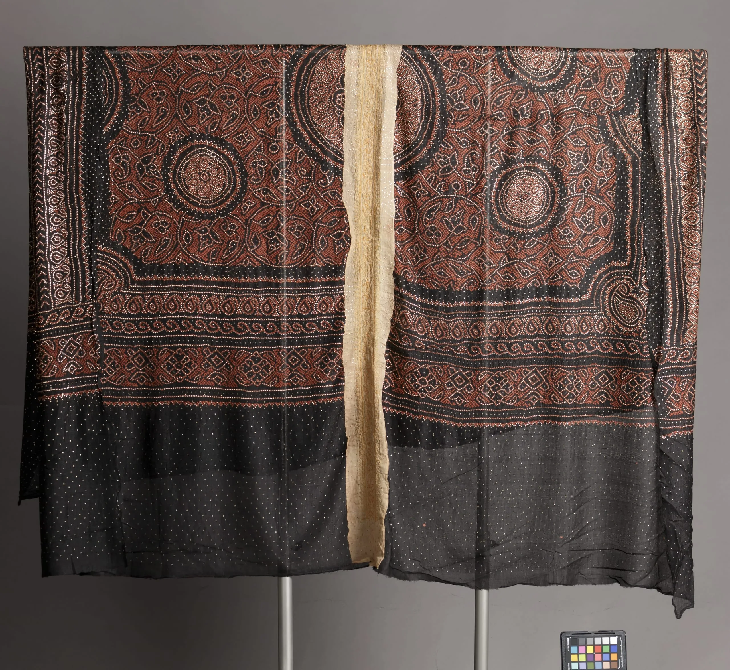 Large block-printed textile in two panels, deep black ground with rust-red and off-white allover paisley and medallion patterns, plain black dotted lower border