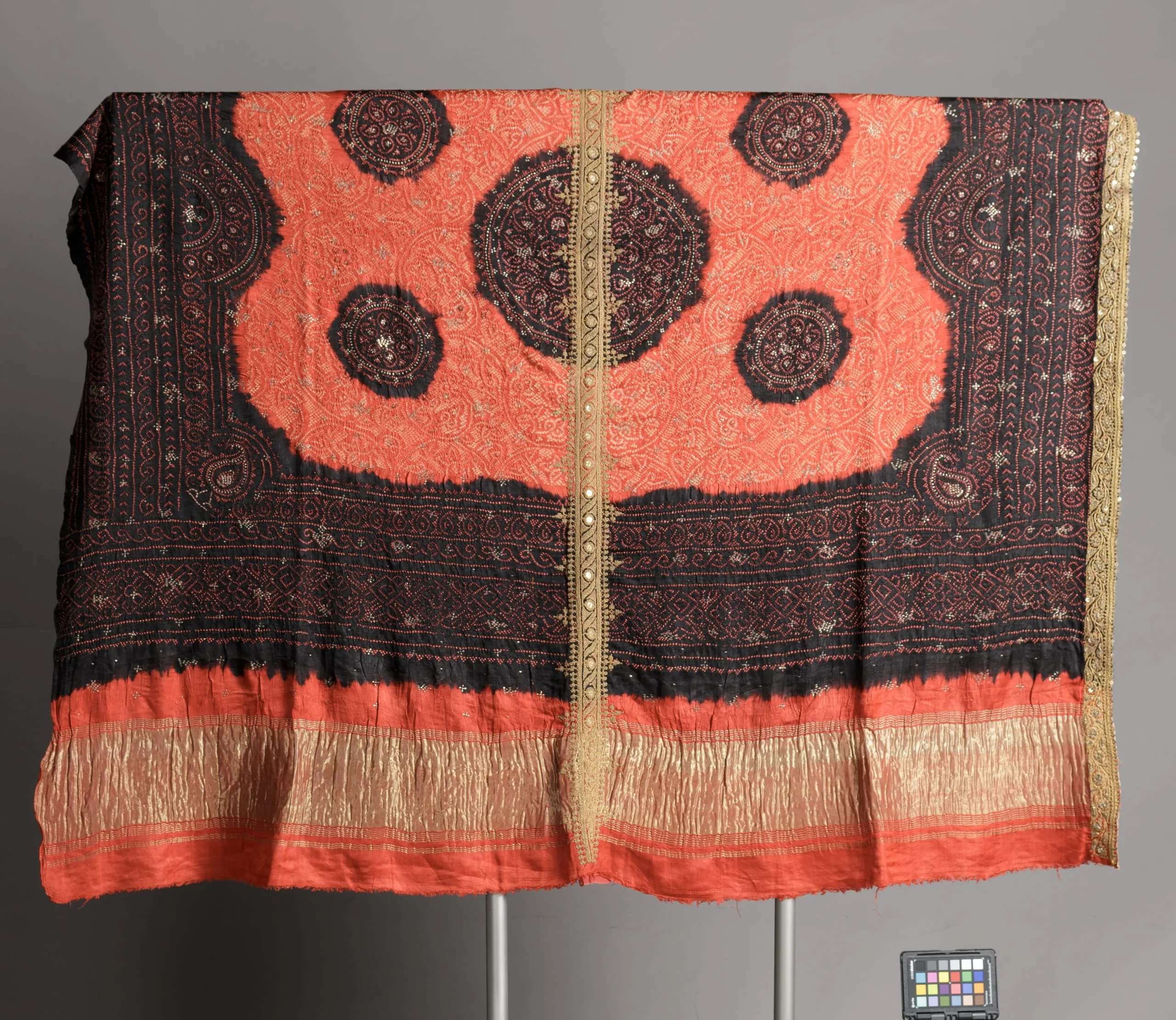 - Silk twill, tie-resist-dyed (bandhani), supplementary mtallic weft patterning, metallic wrapped thread, metallic sequins, and metal strip embroidery