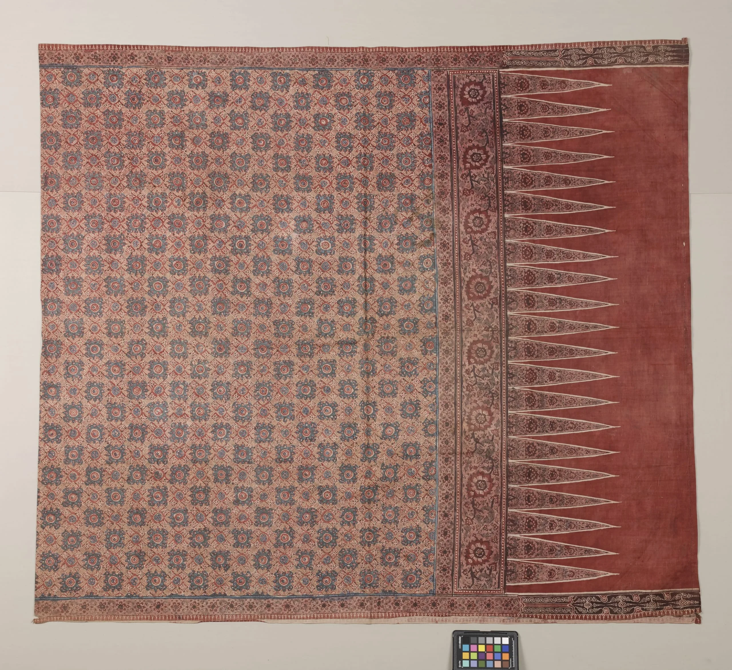 Printed or woven textile with salmon-pink floral lattice field and deep brick red end panel bearing a row of elongated pointed flame shapes with fine white linework