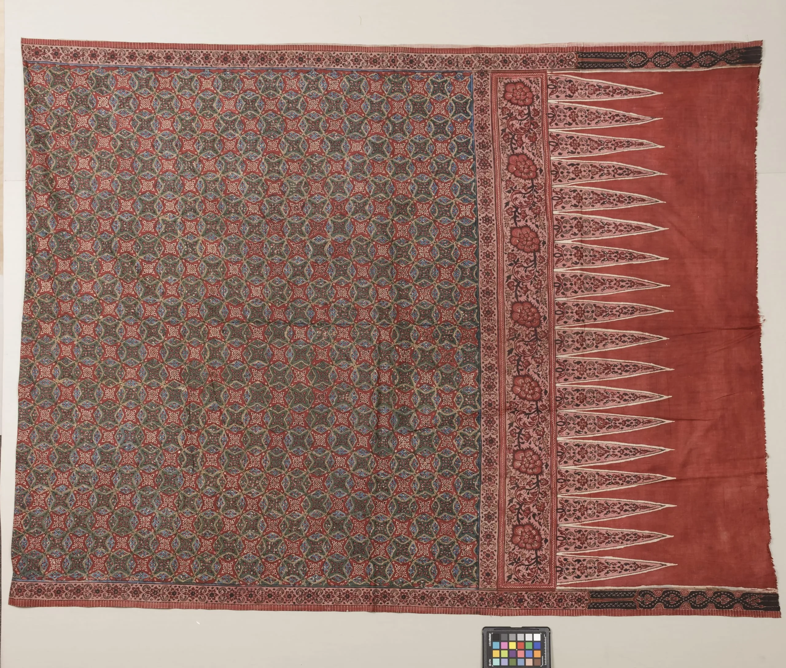 Large printed or dyed textile with a dense geometric rosette field in slate green, rose, and crimson, bordered by a row of elongated pointed forms on a terracotta-red ground