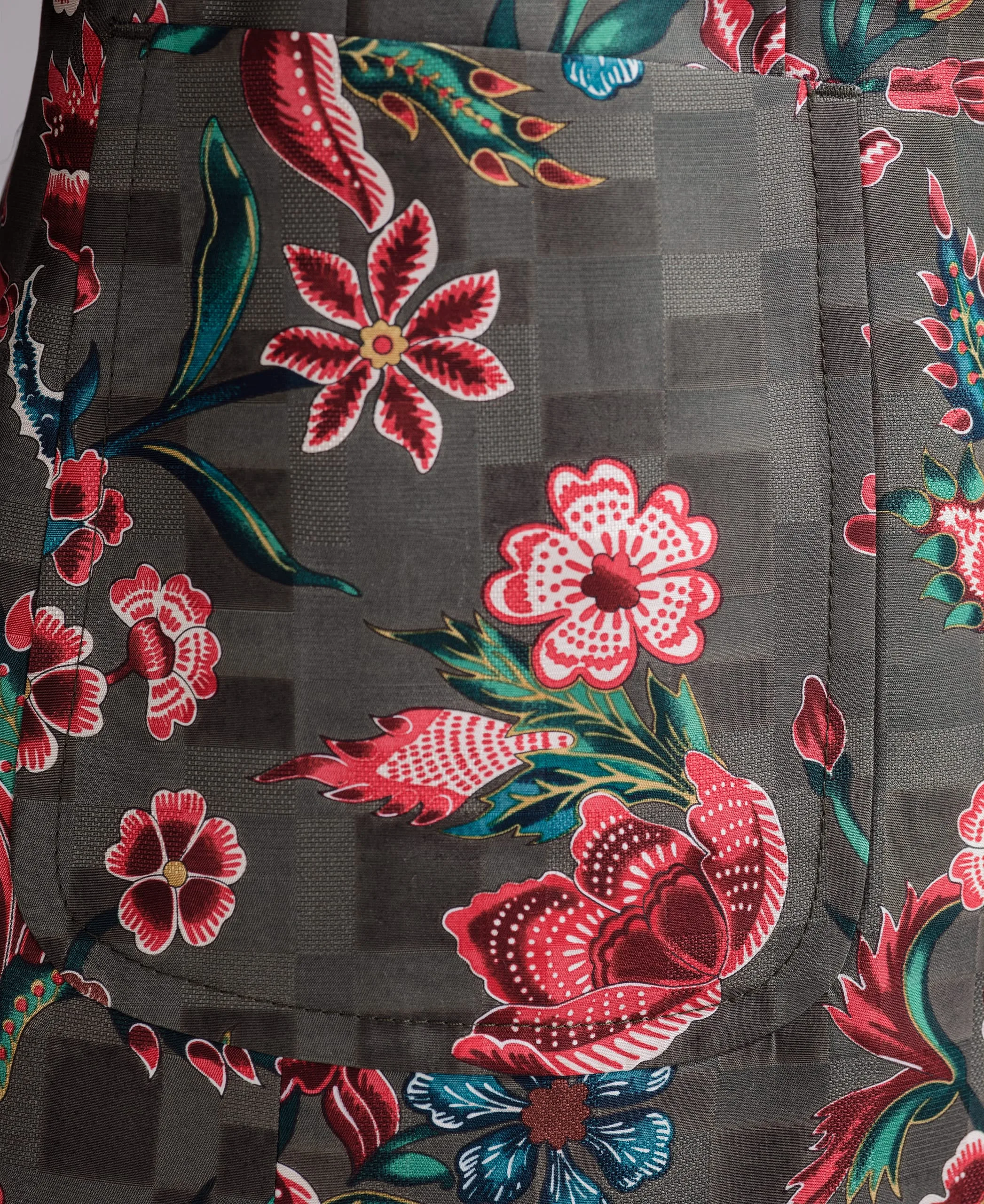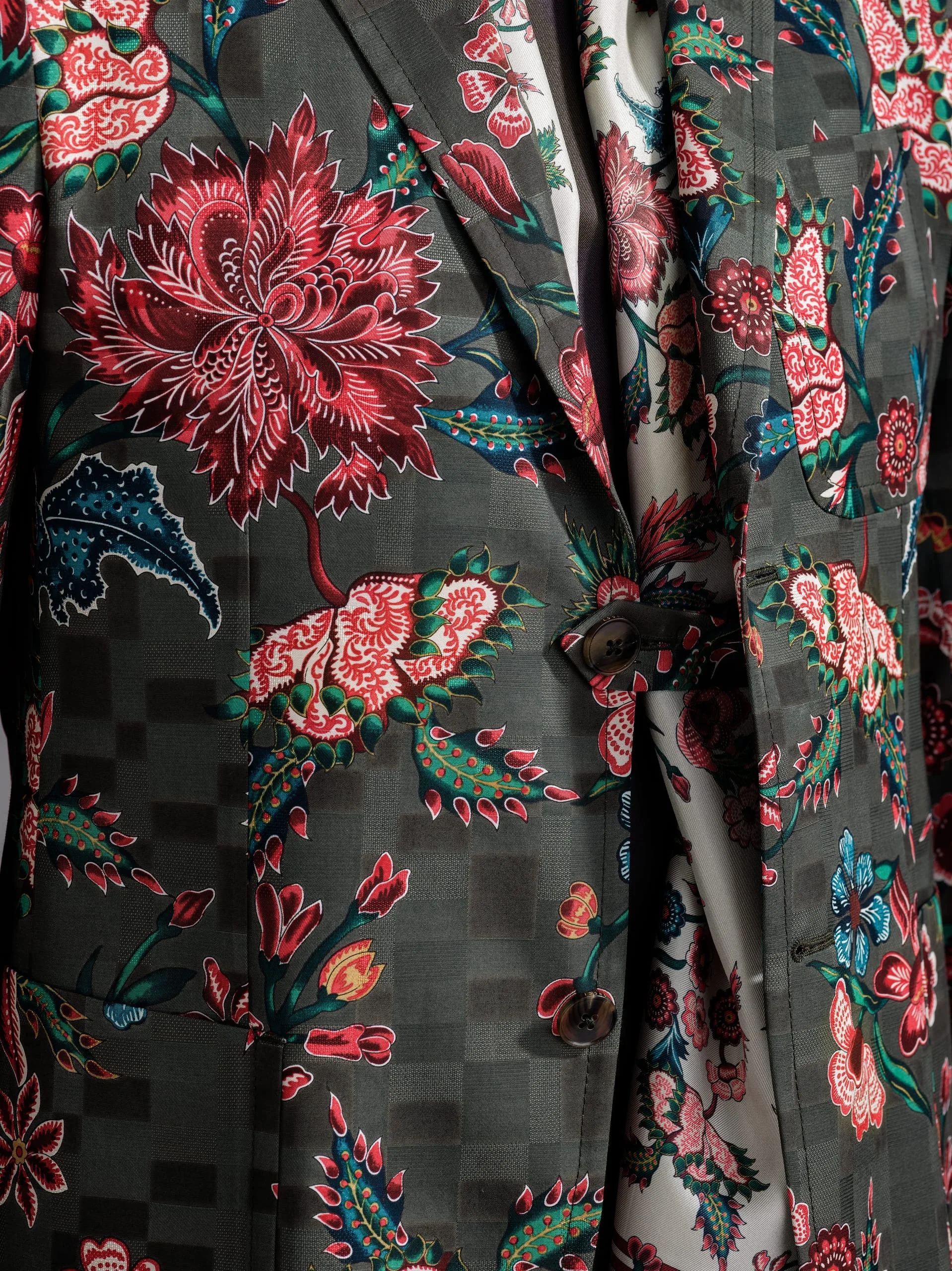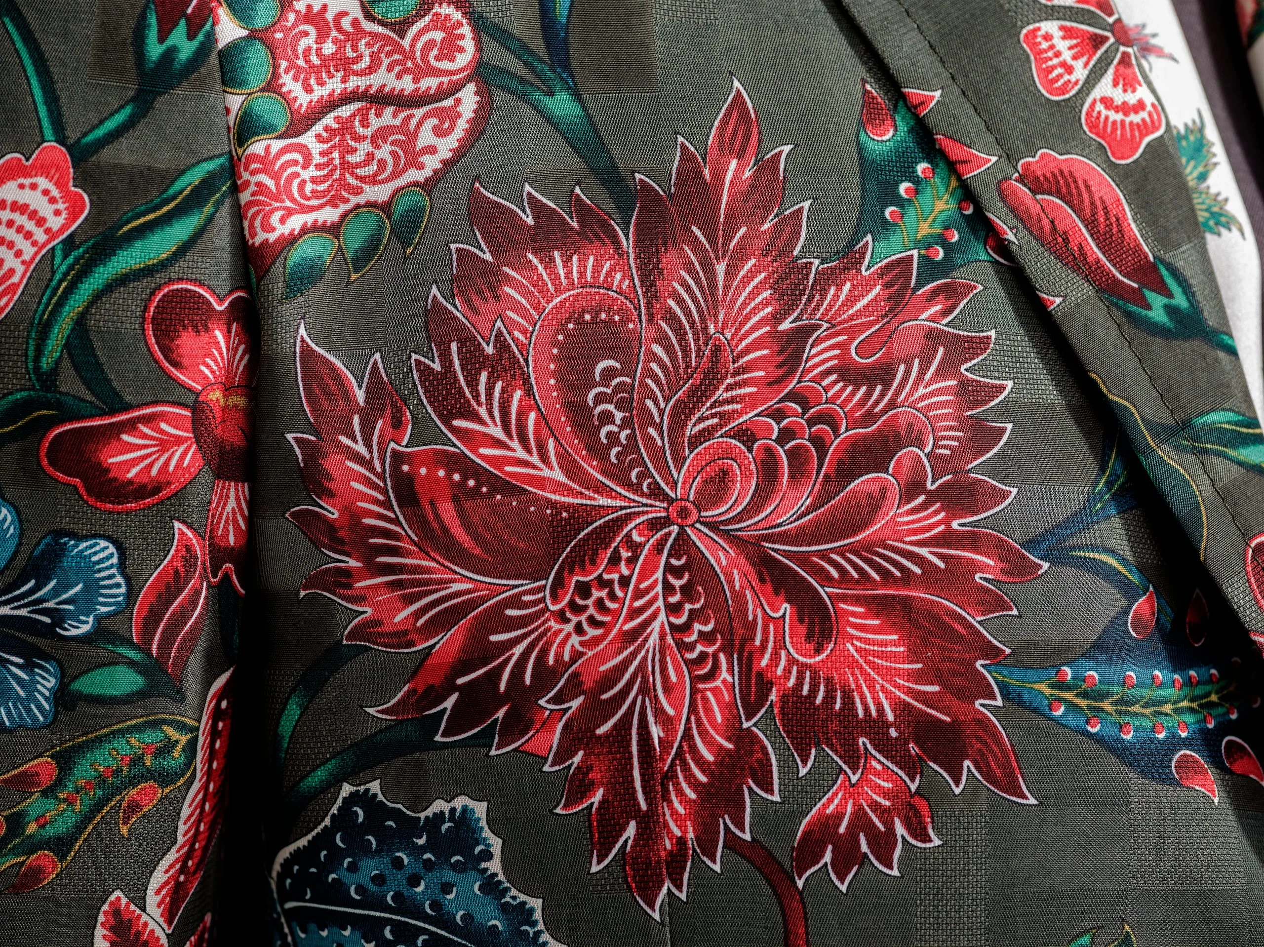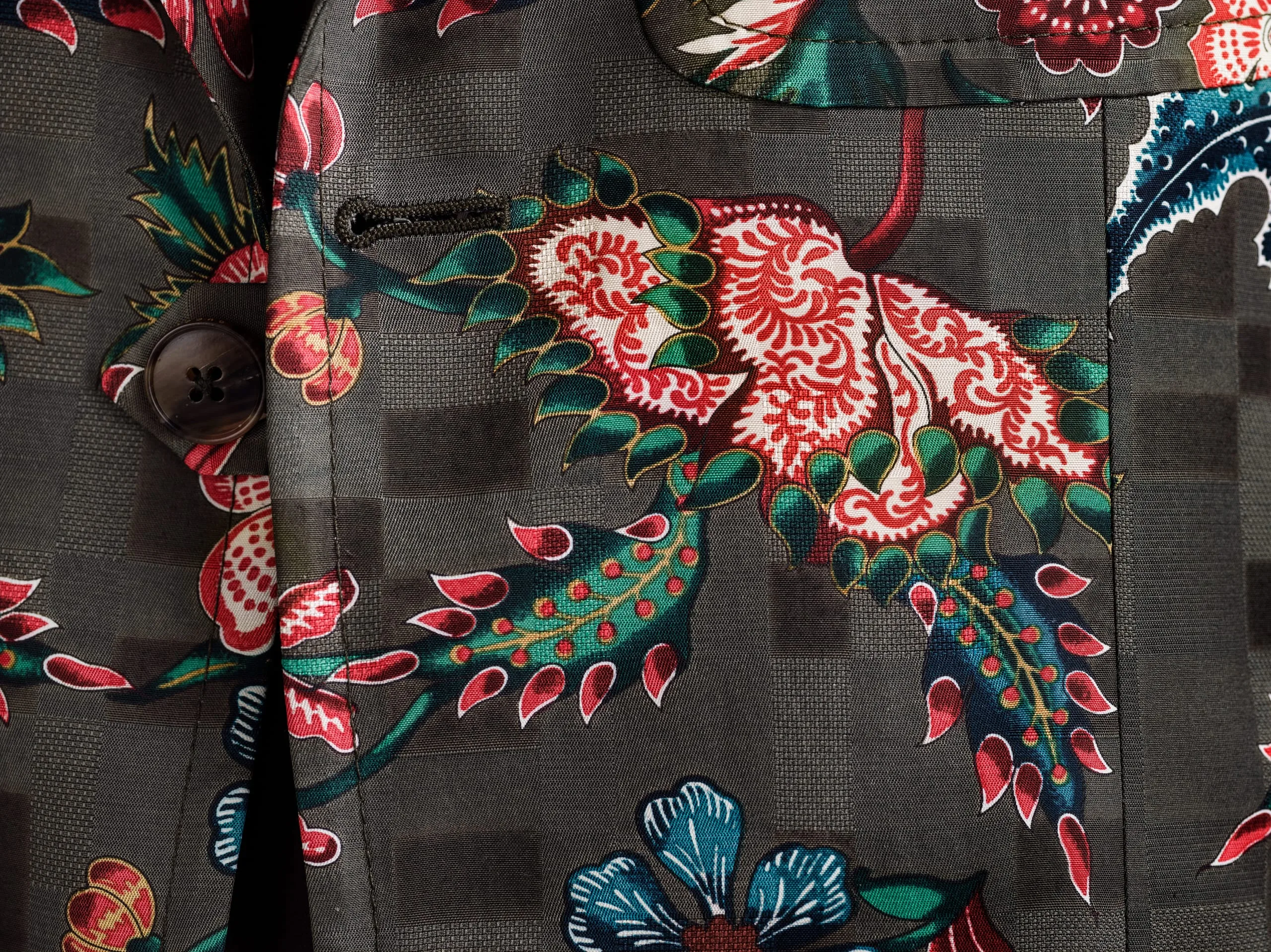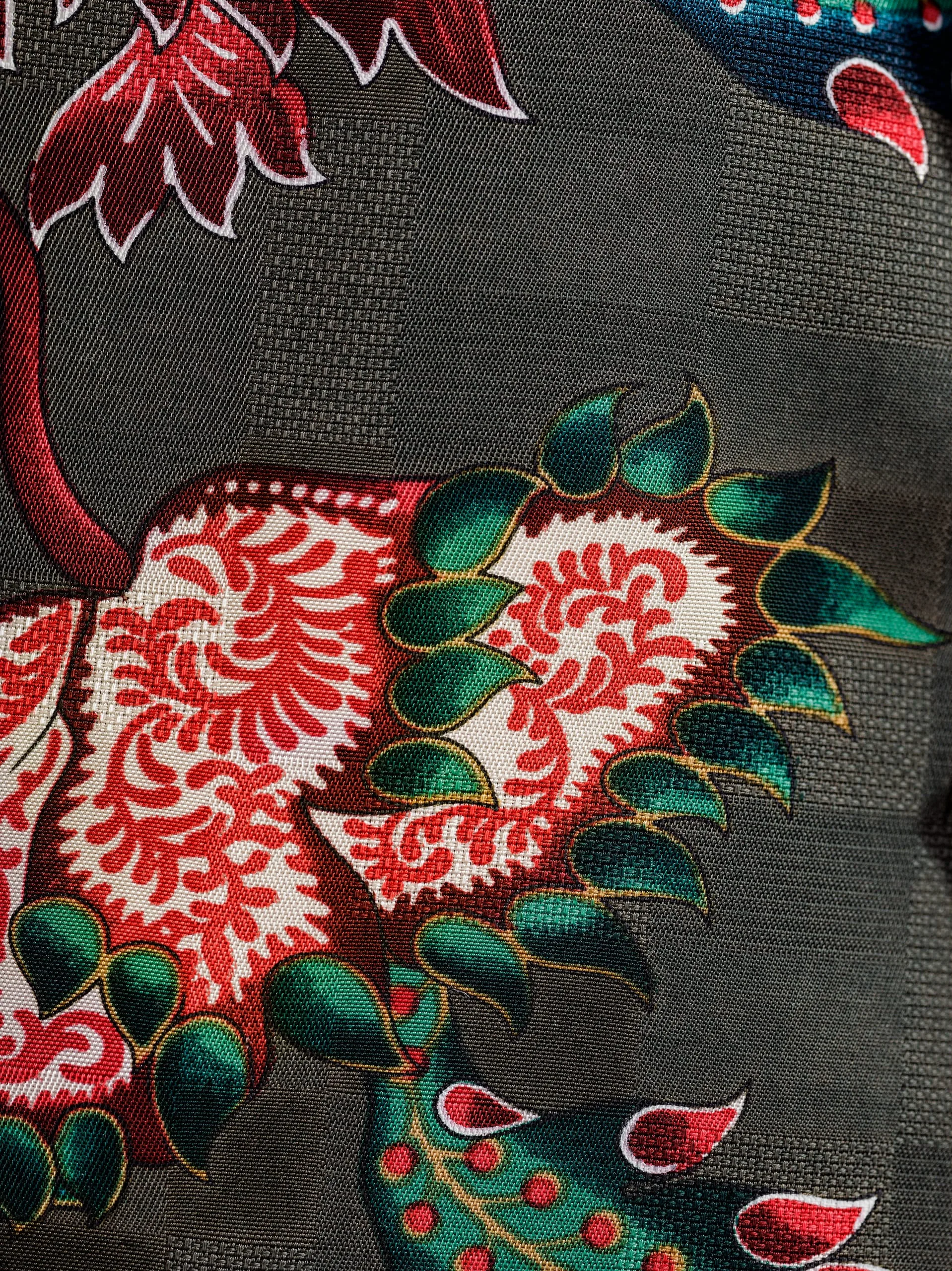 - Jacket: rayon/viscose/cotton damassé, printed