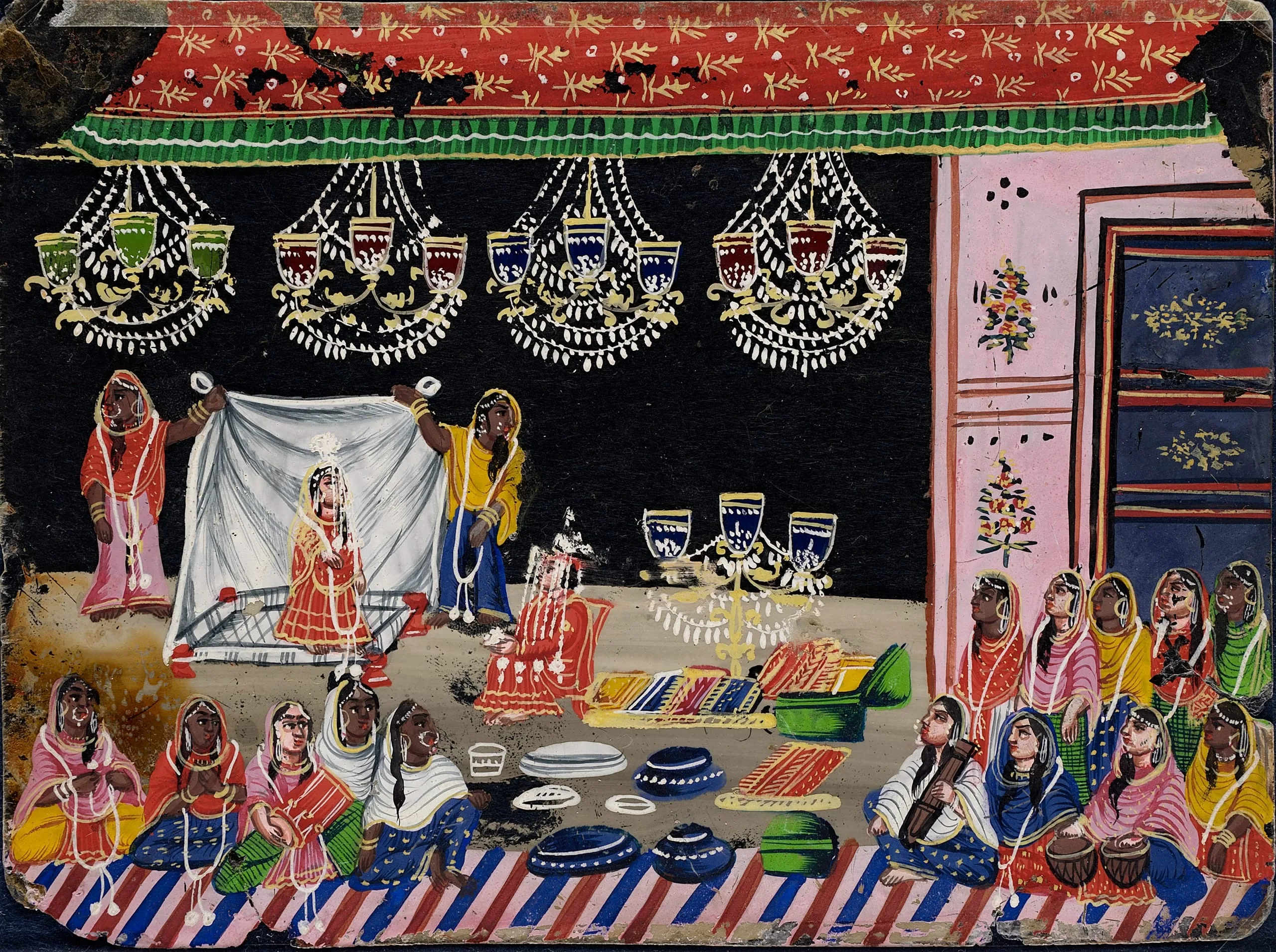 This painting depicts part of a Hindu wedding ceremony taking place at night in the bride’s family house with only her female relatives present. The bride-to-be is standing on a platform behind a canopy held by maidservants. The bridegroom is seated before her wearing floral garlands, formal garments, and holding a bouquet of flowers. Behind him is a sacred lamp and gifts of textiles. Entertainment is provided by an all-female group of musicians and singers.