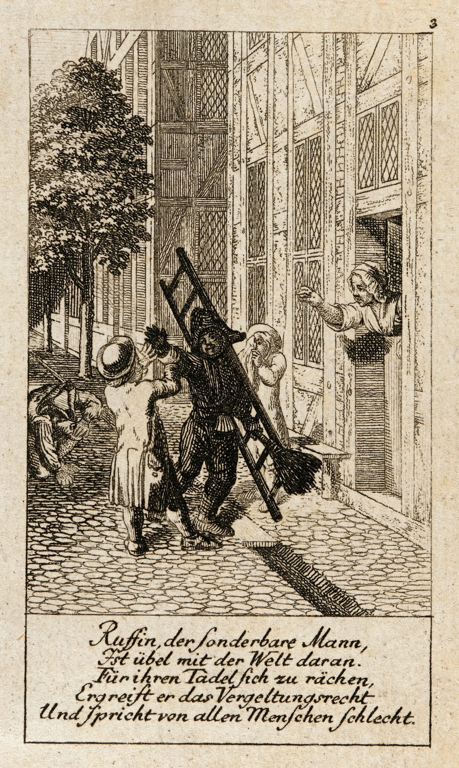 Engraving on cream paper showing a cobblestone street scene with a chimney sweep carrying a ladder and broom, flanked by two figures and a woman leaning from a window above, with German verse below