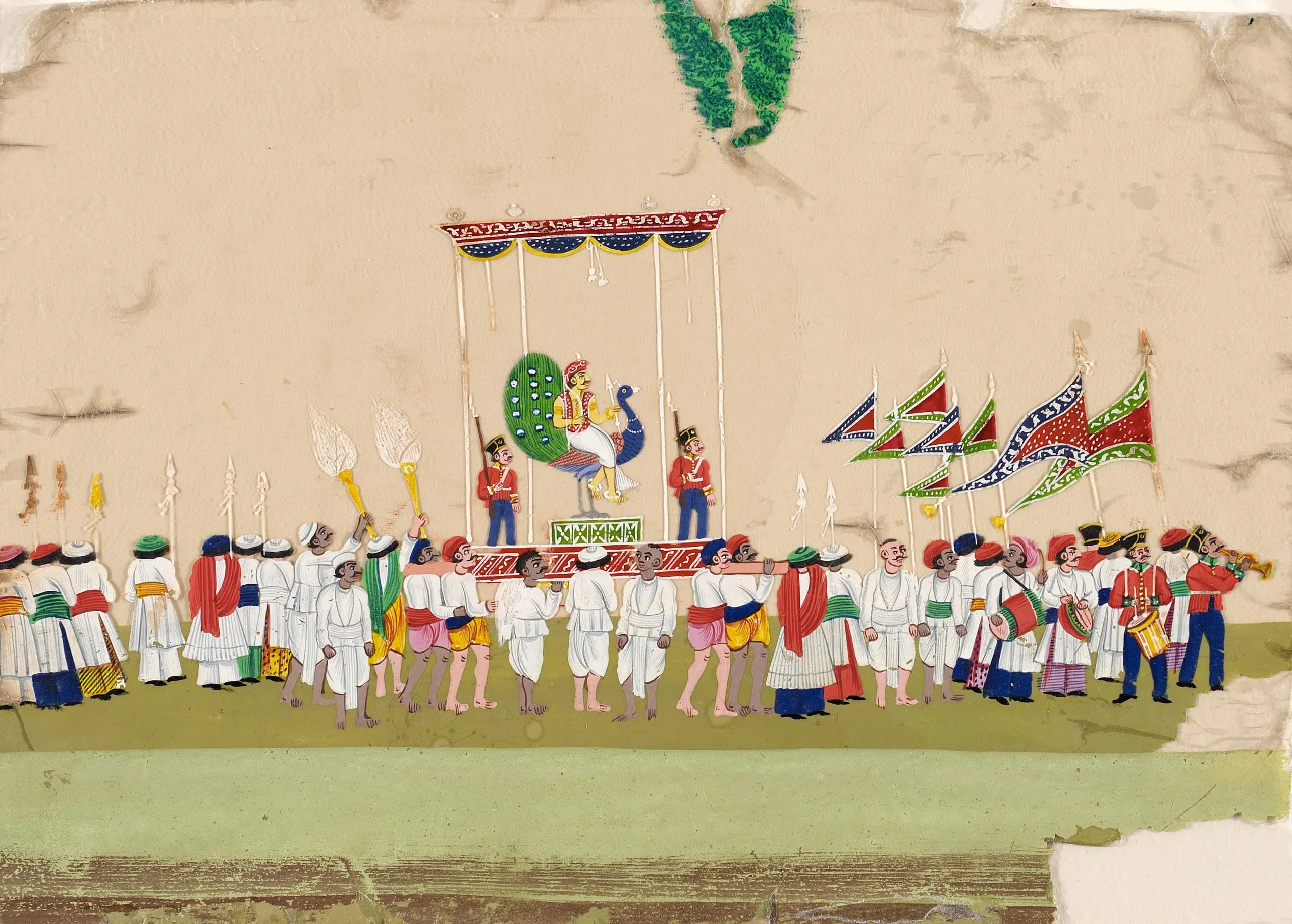 In this painting, a life-sized clay image of the Hindu god Karttikeya mounted on his peacock vehicle (vahana) and holding a bow and arrow is being carried under a canopy on a palanquin while being guarded by two uniformed soldiers. The male retinue includes musicians, standard-bearers, and men waiving an honorific fly whisk made from the white tail-hairs of a yak. The image is being taken for immersion in water for ritual dissolution after worship.