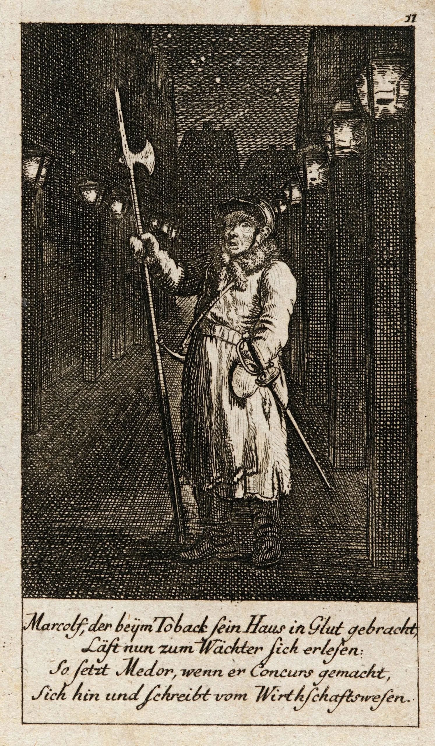 Engraving of a night watchman in fur-trimmed coat and helmet, holding a halberd in a lantern-lit passageway, with four lines of German text below