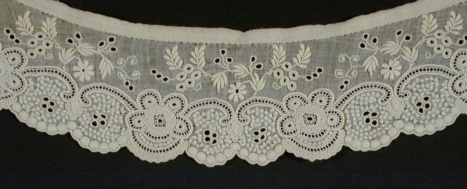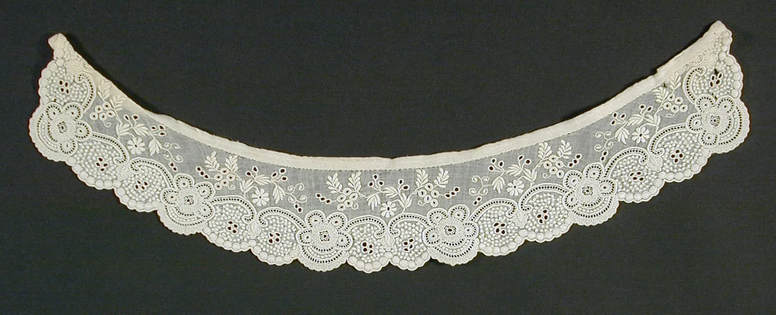 - United States; Collar. C.1850; fine white cotton in a four-petaled motif centered with lace stitch, seed stitch; 12 1/2 x 2 in.