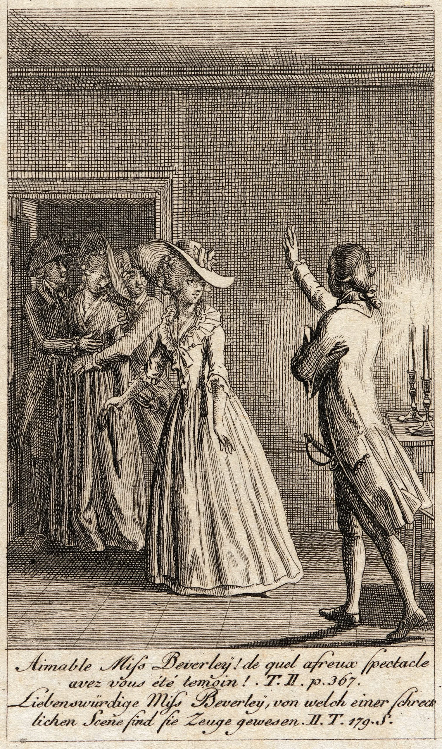 Engraving on cream paper showing four figures in an 18th-century interior: a man with raised arm faces three figures emerging from a shadowed doorway, candlelit table at right, with French and German captions below
