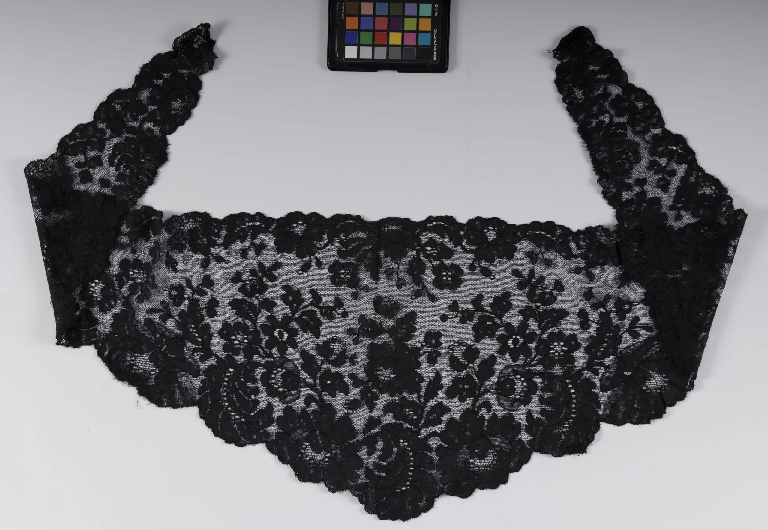 Black machine lace collar or neckpiece laid flat, with allover floral pattern on sheer net ground and scalloped edges along all borders