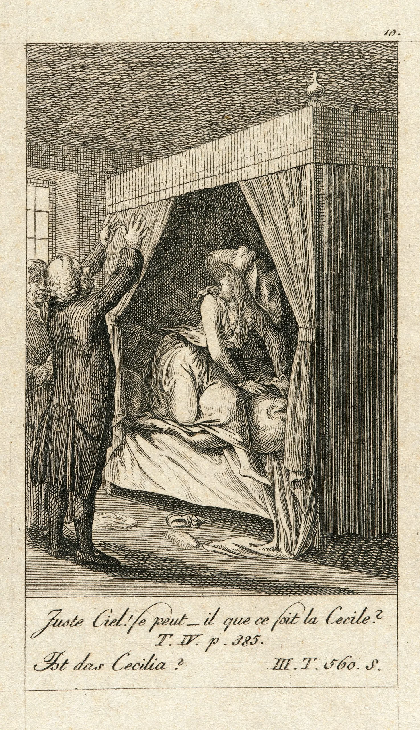 Engraving on cream paper showing two alarmed men in wigs reacting to a woman seated inside a curtained four-poster bed, with a bird atop the canopy; French and German captions below