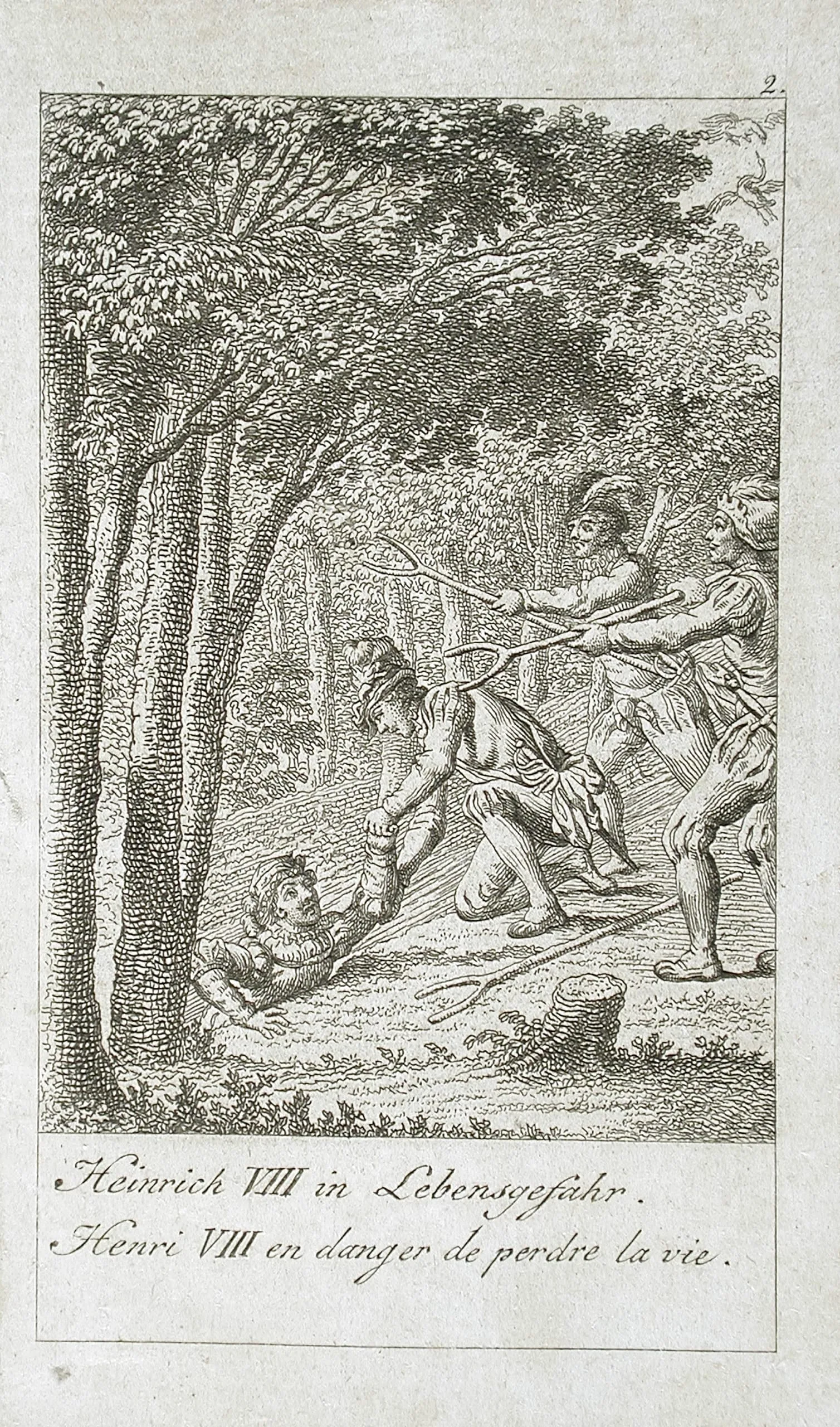 Engraving on cream paper showing four figures in a wooded clearing, one fallen on the ground while others menace with long poles; German and French caption below
