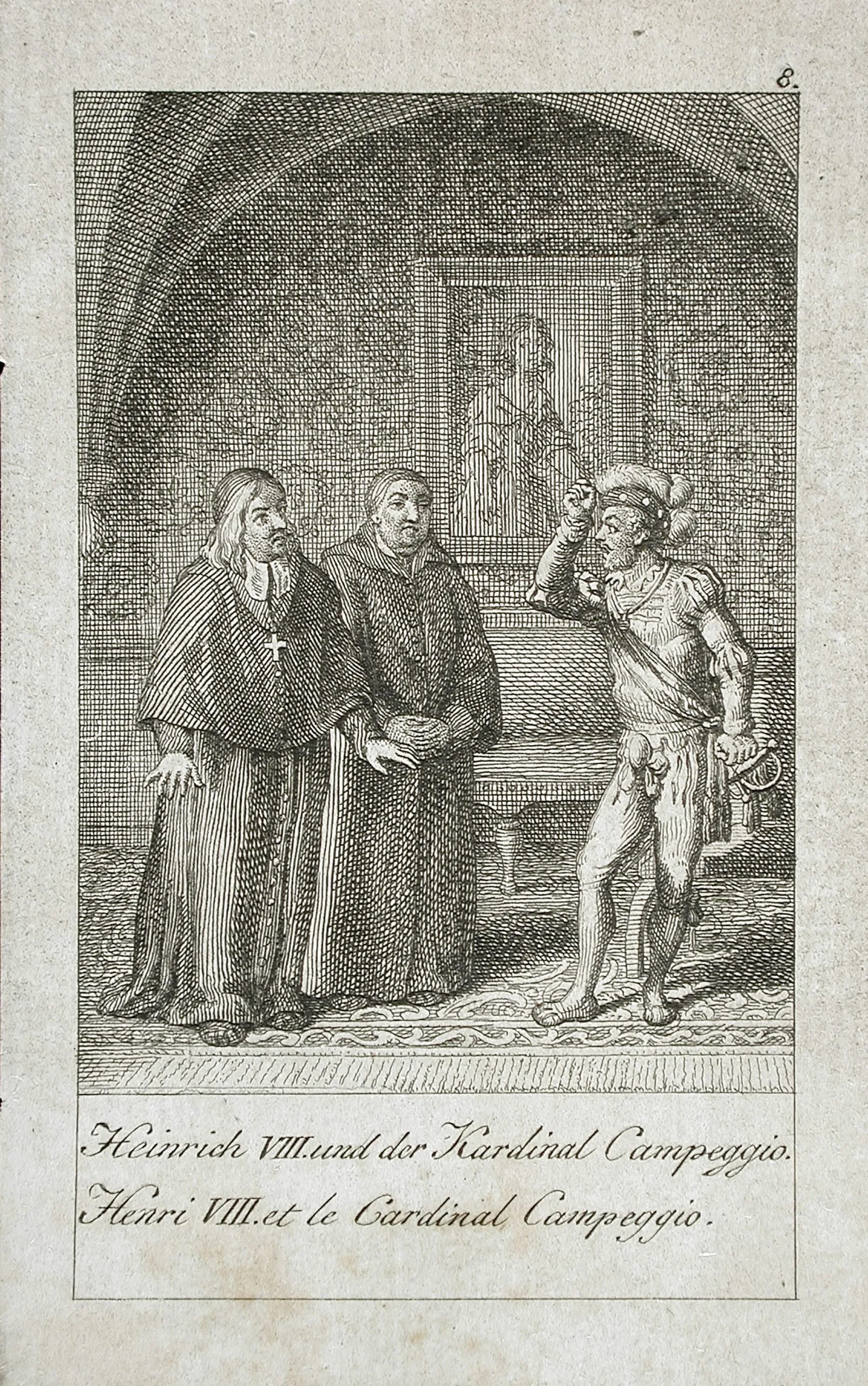 Engraving on cream paper showing three figures in a vaulted interior: two robed clerics on the left facing an armored, gesturing man on the right, with German and French captions below
