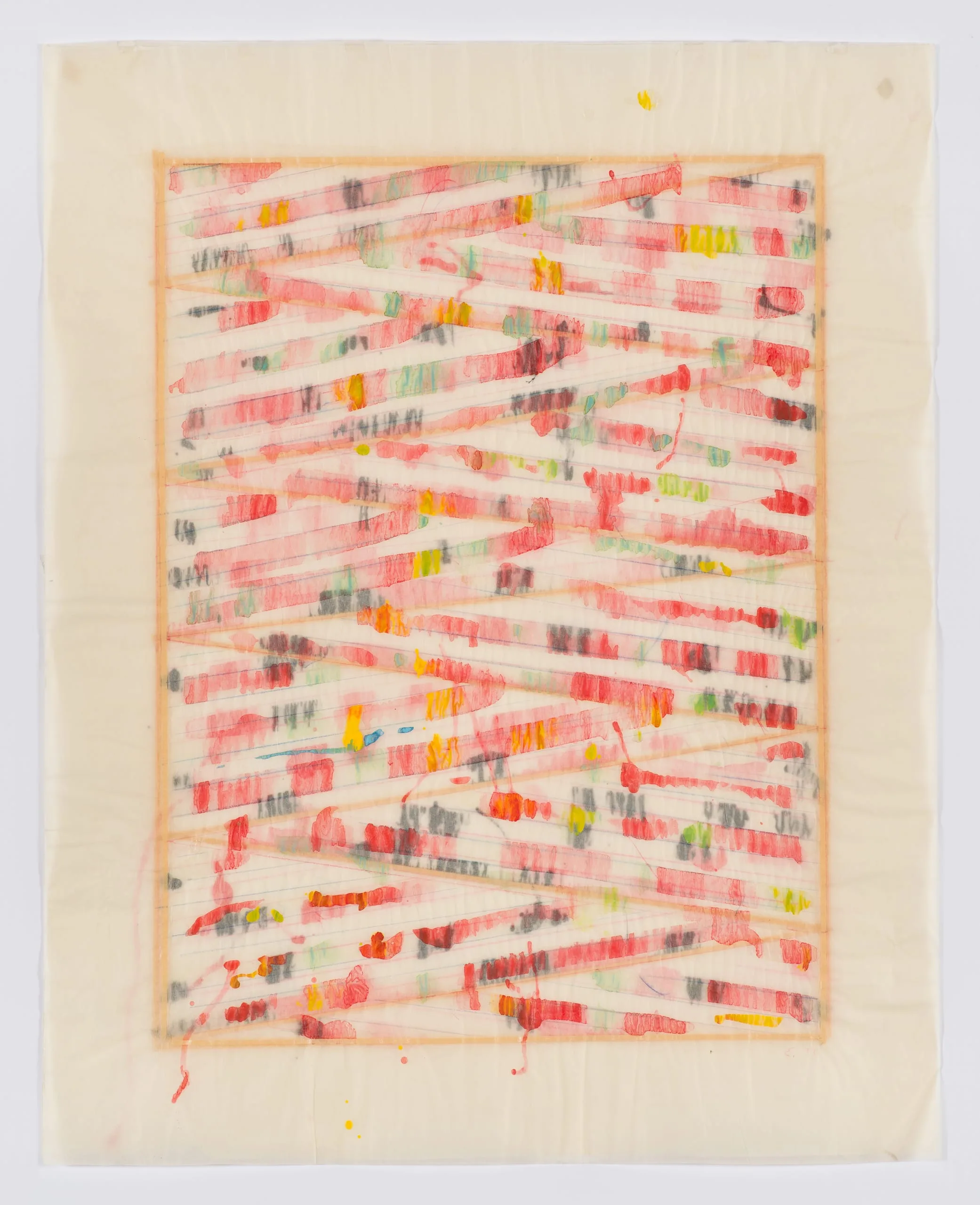 - Acrylic, colored pencil, and masking tape on two layers of tracing paper