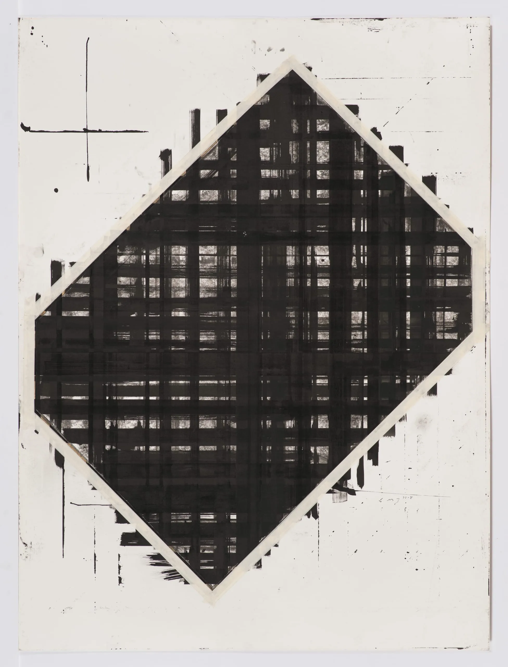 - Charcoal, acrylic, India ink, and masking tape on rag mat board