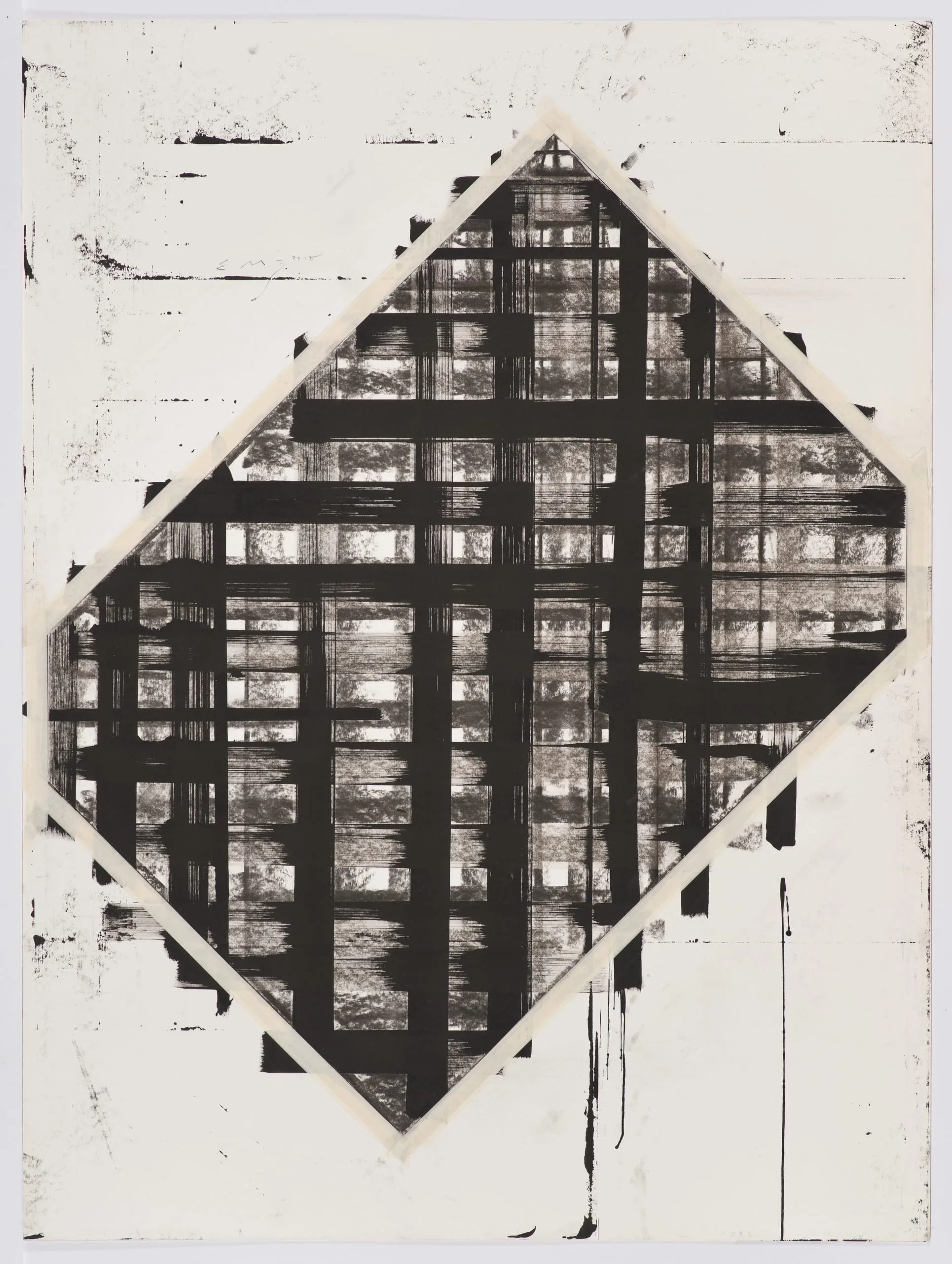 - Charcoal, acrylic, India ink, and masking tape on Strathmore board