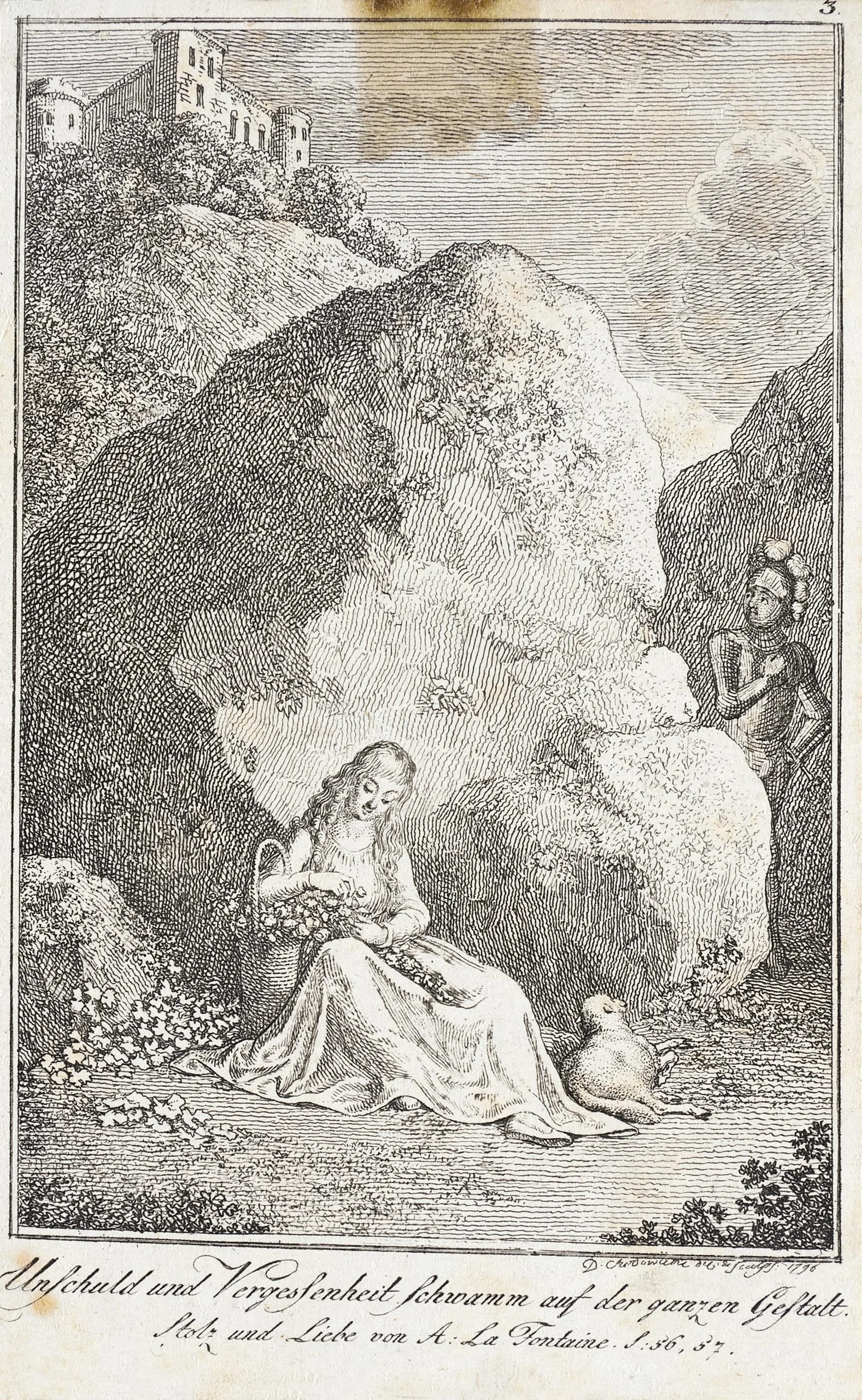 Engraving on cream paper of a young woman in a long dress seated among boulders, holding flowers, with a small animal beside her and an armored figure visible to the right