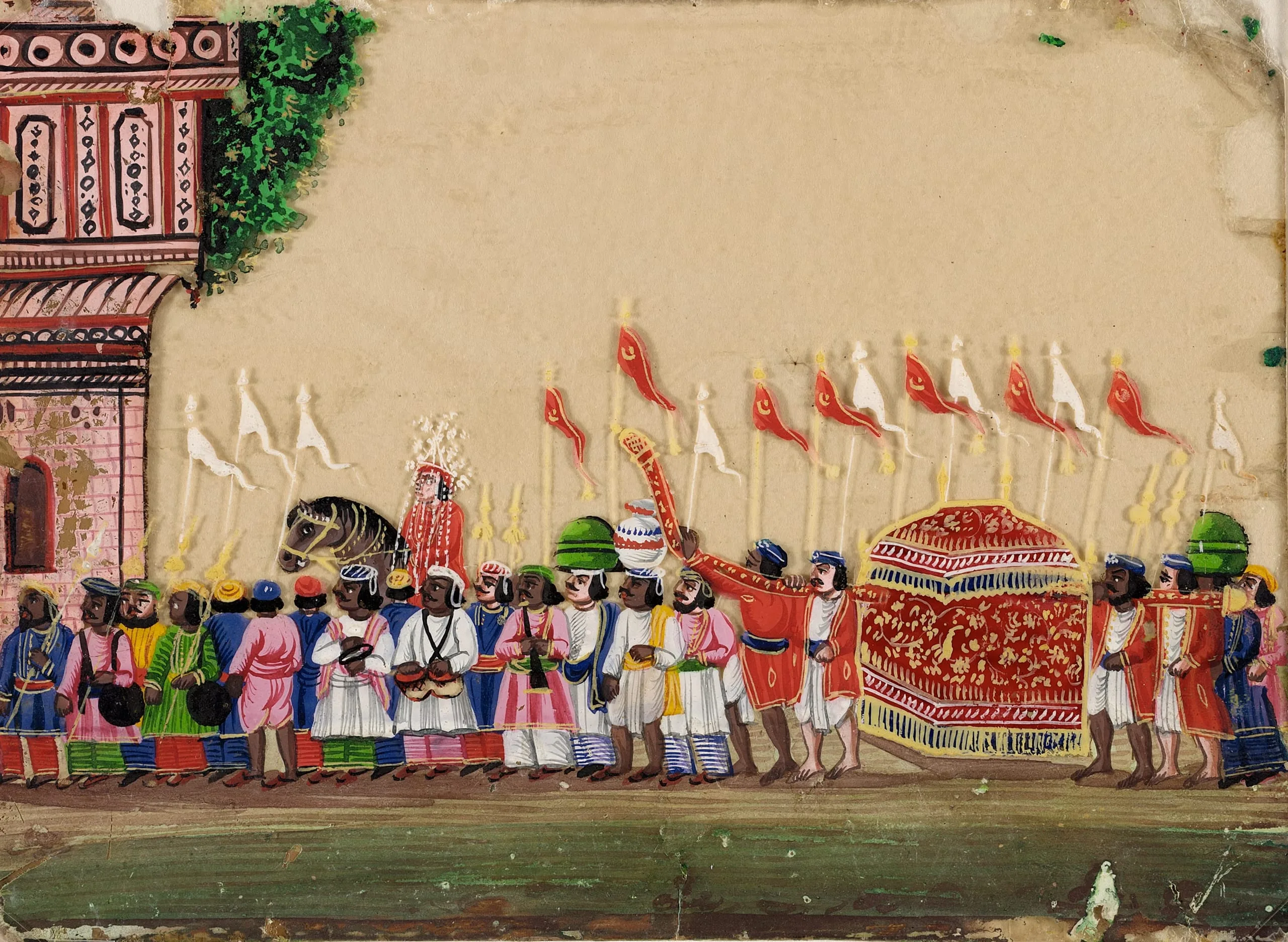 In this painting, the bridegroom dressed in princely attire with floral garlands proceeds on horseback to the bride’s house. He is accompanied in the daytime marriage procession by male musicians, bodyguards, servants, and palanquin bearers. The covered palanquin holds his female relatives. Standards flying flags with a crescent moon and star imply that it is a Muslim wedding.
