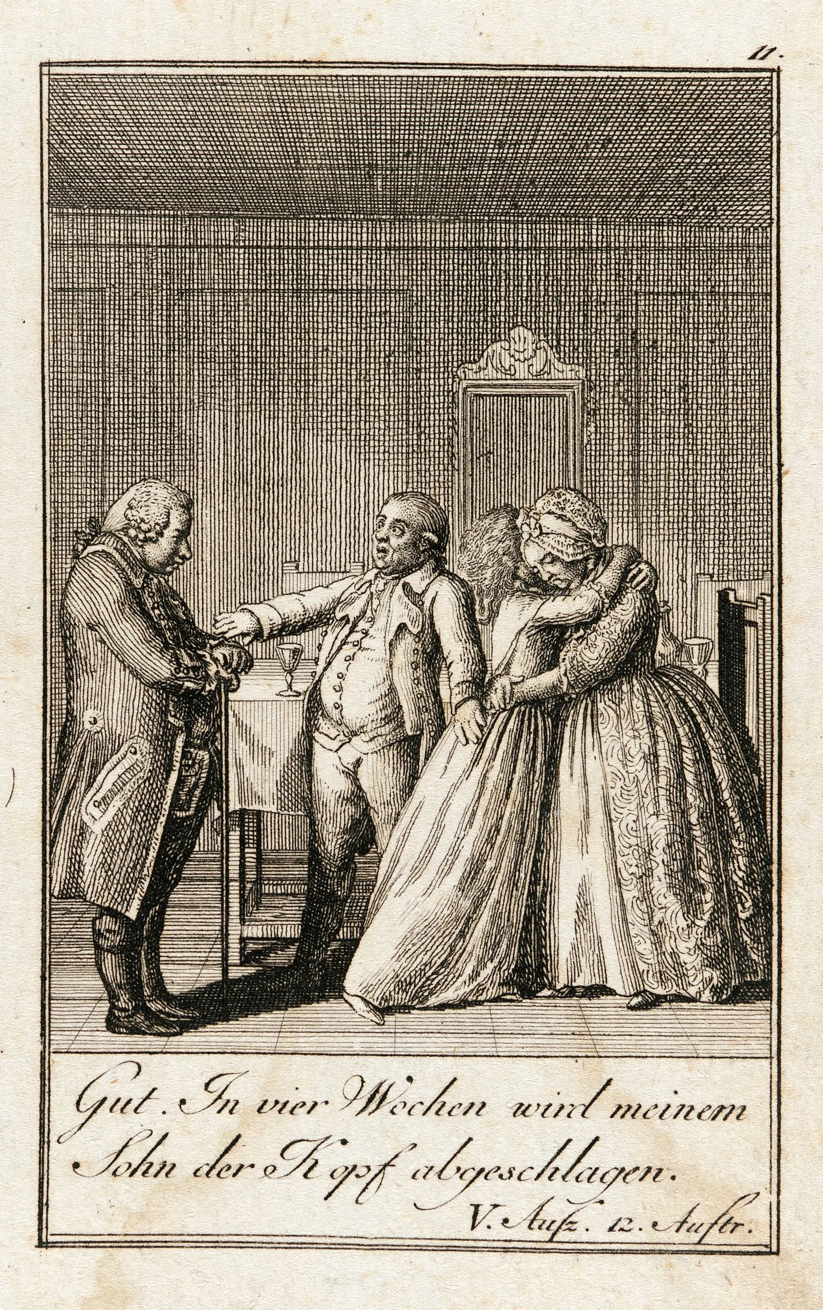 Engraving on cream paper, four figures in 18th-century dress inside a paneled room, with German cursive text below