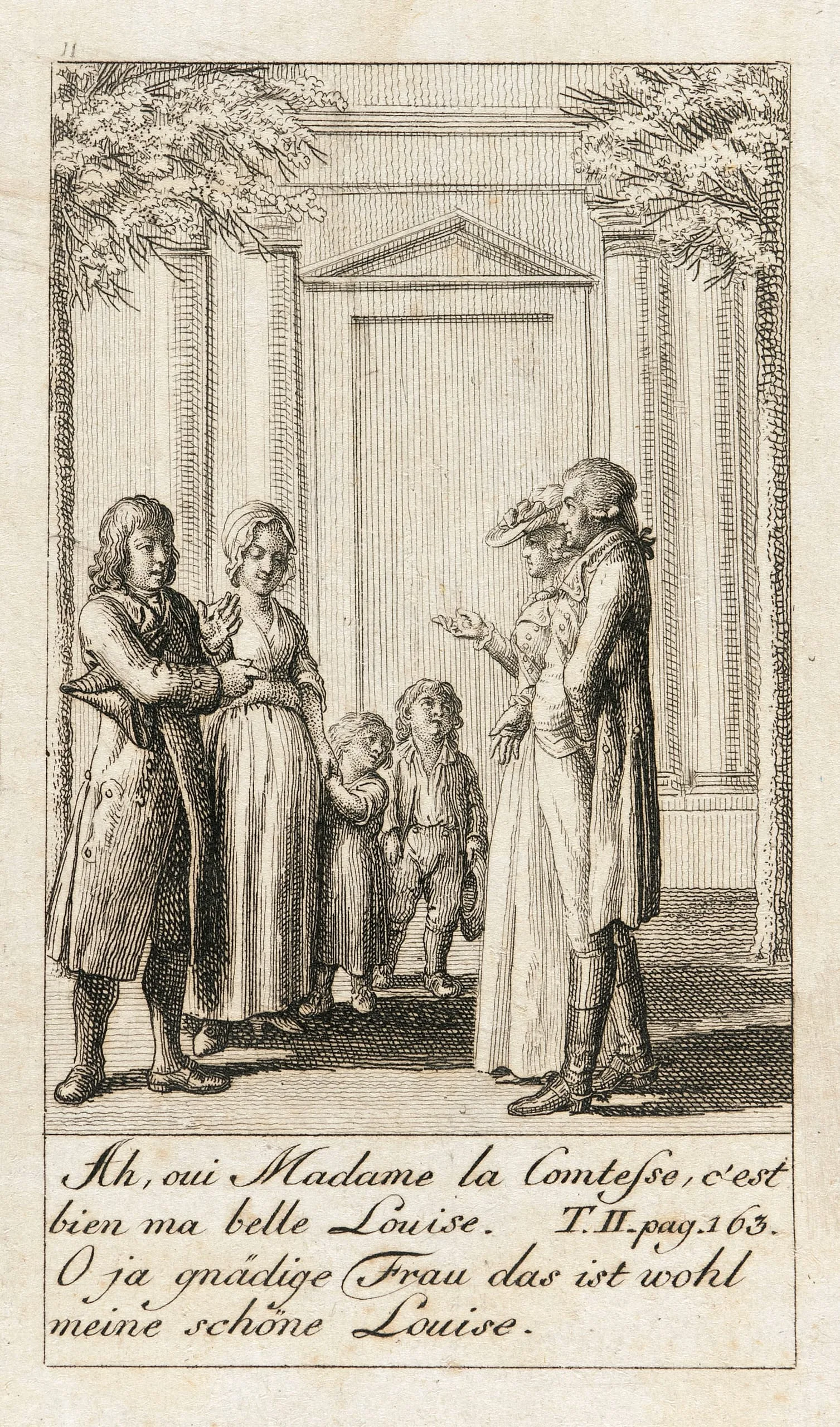 Engraving on cream paper showing six figures — two adults, a woman, a boy, and two toddlers — gathered before a columned doorway, with bilingual French and German text below