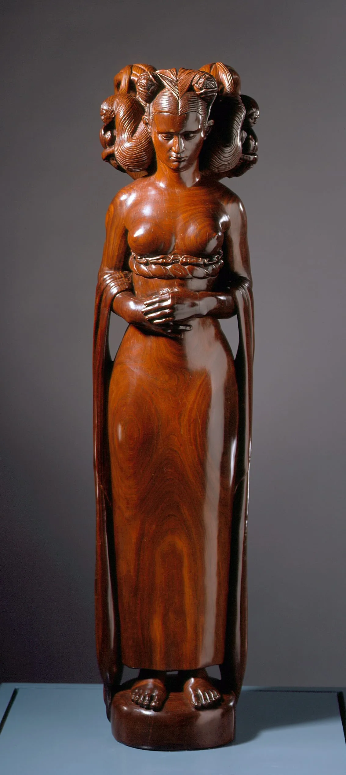 Hord was an amateur archaeologist and was fascinated with the indigenous culture of the Southwest. In his art he attempted to represent in human form the forces of nature that the Native Americans believed controlled their lives, such as corn, their basic food staple, which they deified. Hord carved Young Maize, 1931 (San Diego Museum of Art), as a powerful young man symbolizing the sturdy stalk of a new plant. In The Corn Goddess Hord presents a strong, voluptuous figure to suggest the fecundity of the earth. The waves of her elaborate hair arrangement form a soft bed from which two ears of corn emerge, and two small figures representing sprouting corn grow upwards on stalks from her back. This swirling arrangement of hair, an essential, symbolic element, is present in many of Hord’s carvings of the early 1940s, as are figures depicted with the broad, fiat facial features of the Native American.