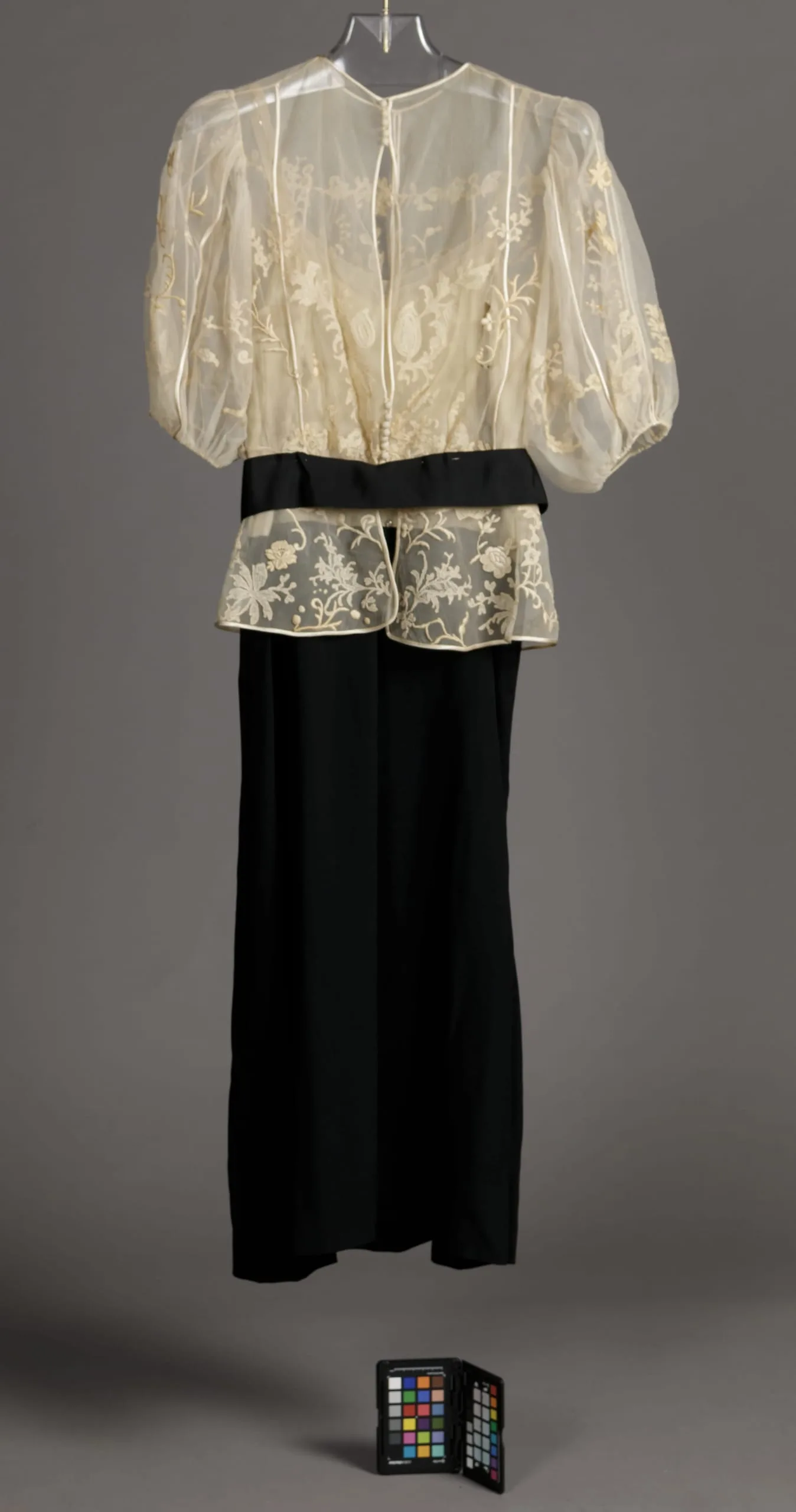 - Blouse: silk gauze with silk and linen lace appliqué, cotton embroidered applique, silk satin, and silk plain weave (faille) ribbon; Underdress: silk plain weave (crepe) with silk gauze