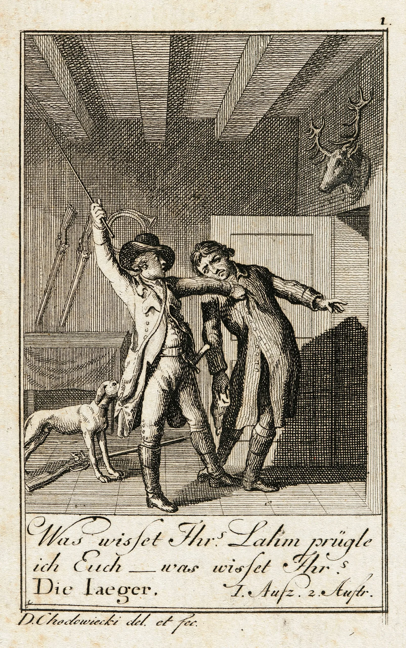 Engraving of two men struggling inside a hunting room, one raising a whip overhead, with a hound, mounted stag head, and German caption below