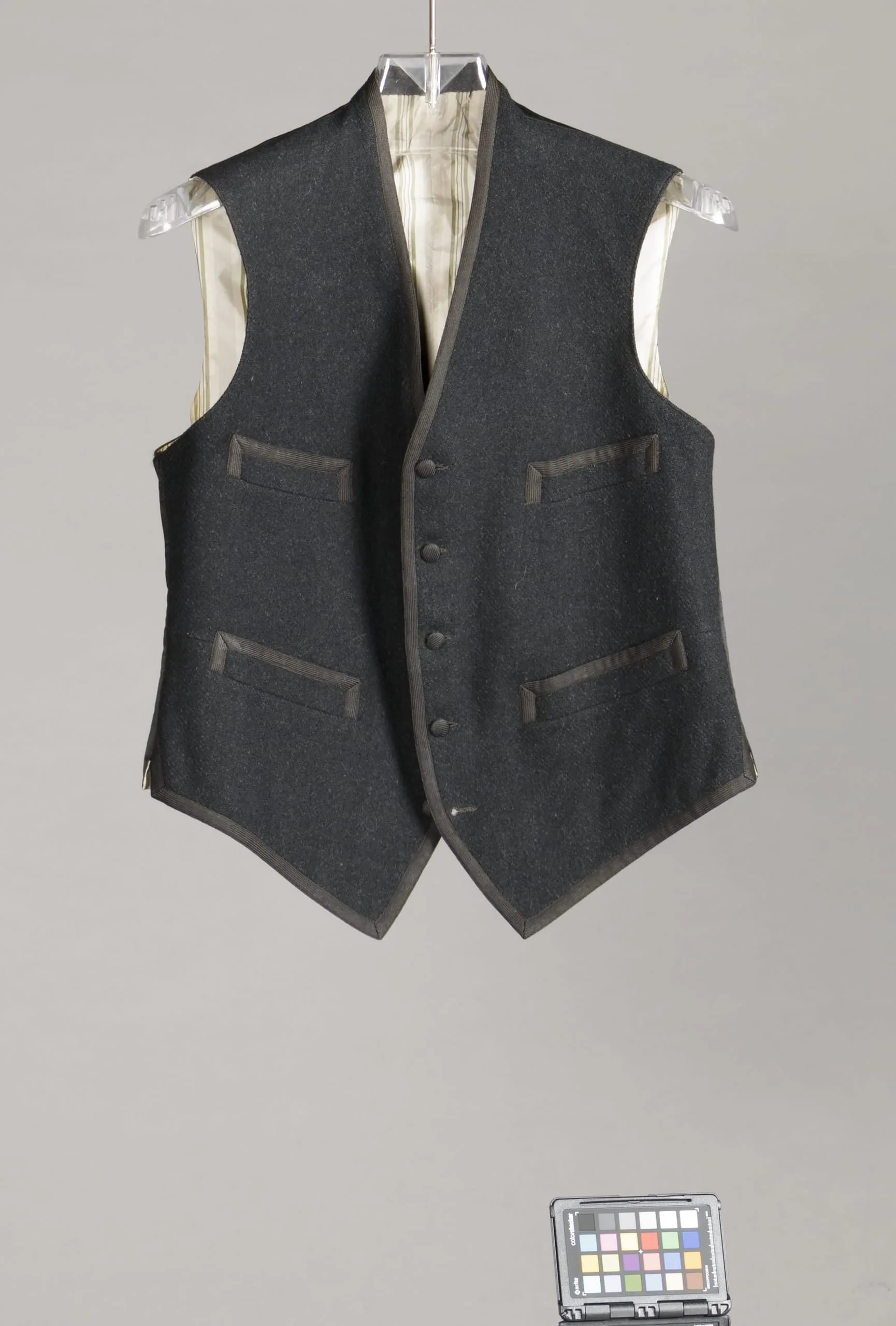 - Coat and Vest: wool twill with silk braid trim and silk covered buttons; Trousers: wool twill