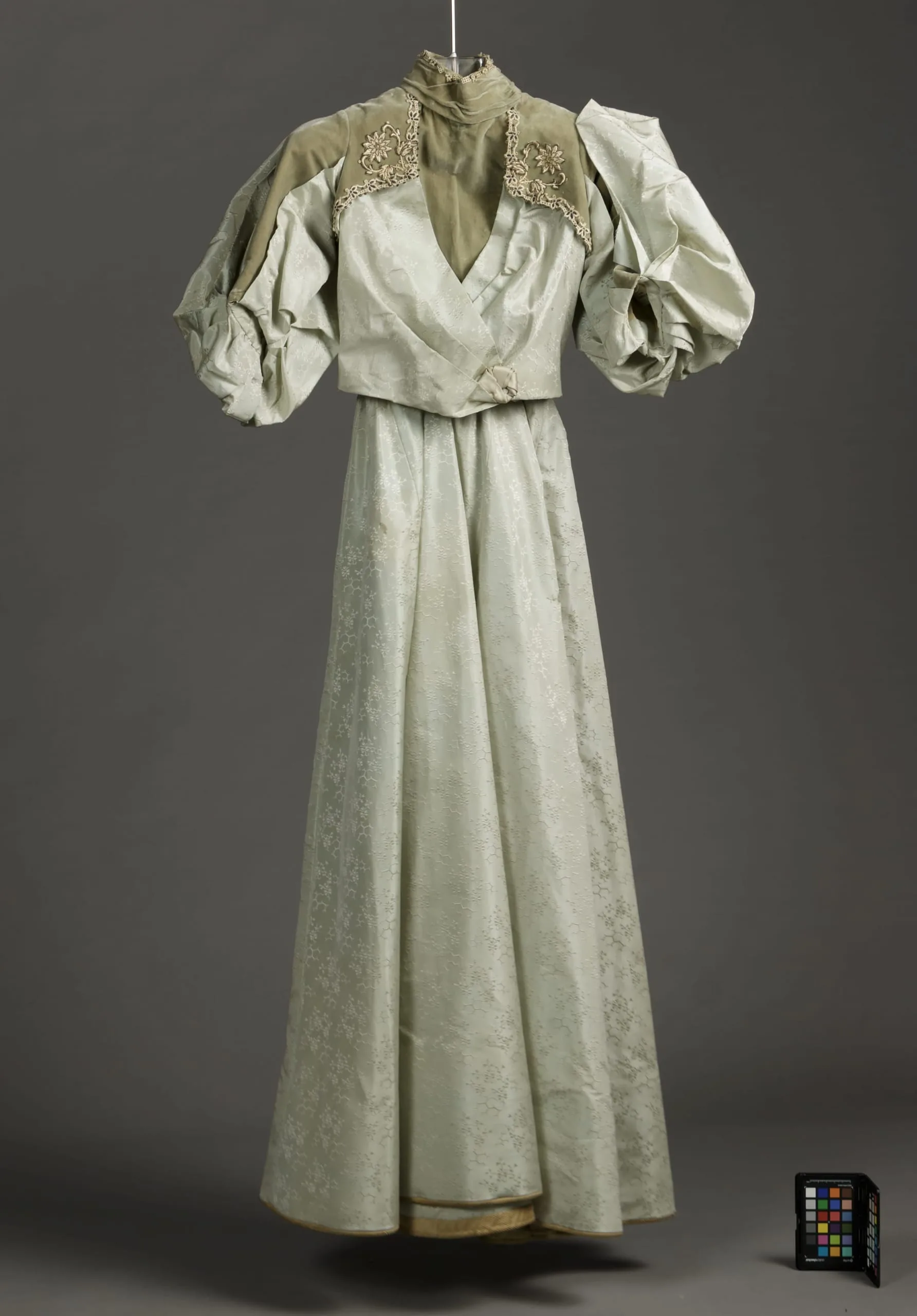 - Bodice: silk plain weave (faille) with warp float patterning, silk plain weave (chiffon); Bodice: silk plain weave (faille) with waarp float patterning, silk velvet, silk and metallic thread appliqué, and silk satin; Skirt: silk plain weave (faille) with warp float patterning