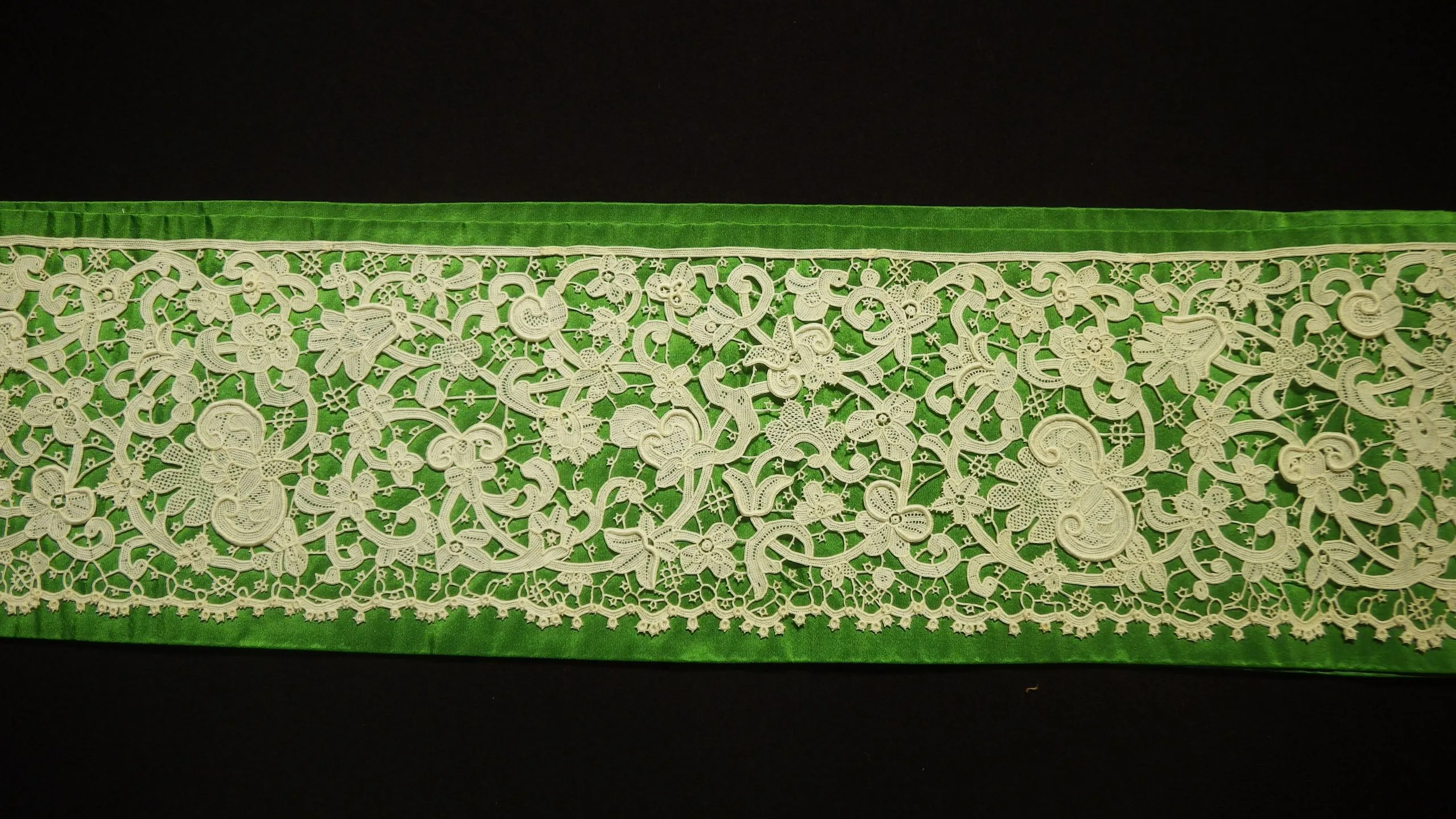 Horizontal band of cream needle or bobbin lace with allover floral and scrolling vine pattern, mounted on a Kelly green fabric backing against a black surface