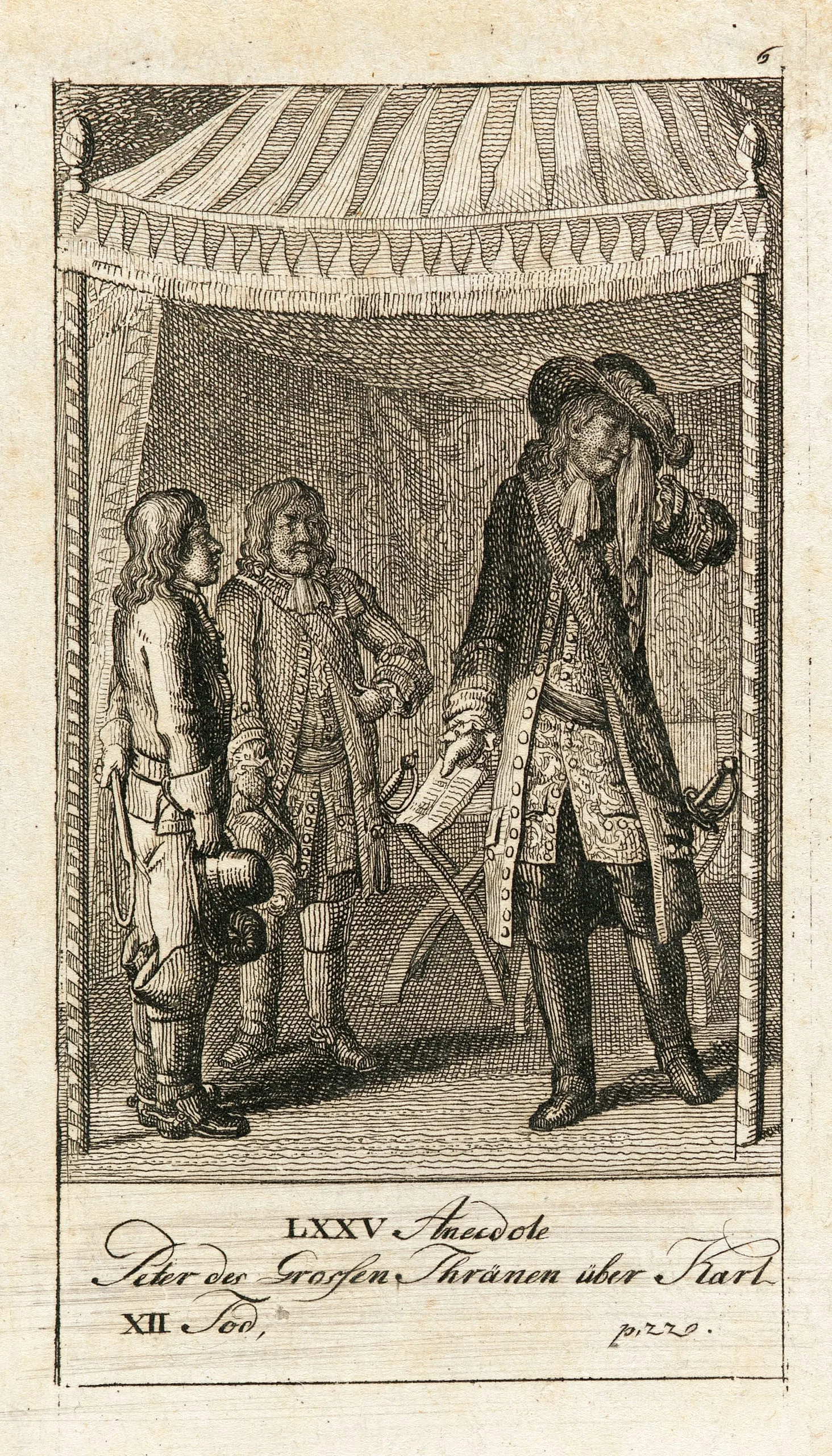 Engraving on cream paper, three men in 17th-century dress inside a tent; one tall figure in plumed hat raises hand to face while two others stand opposite