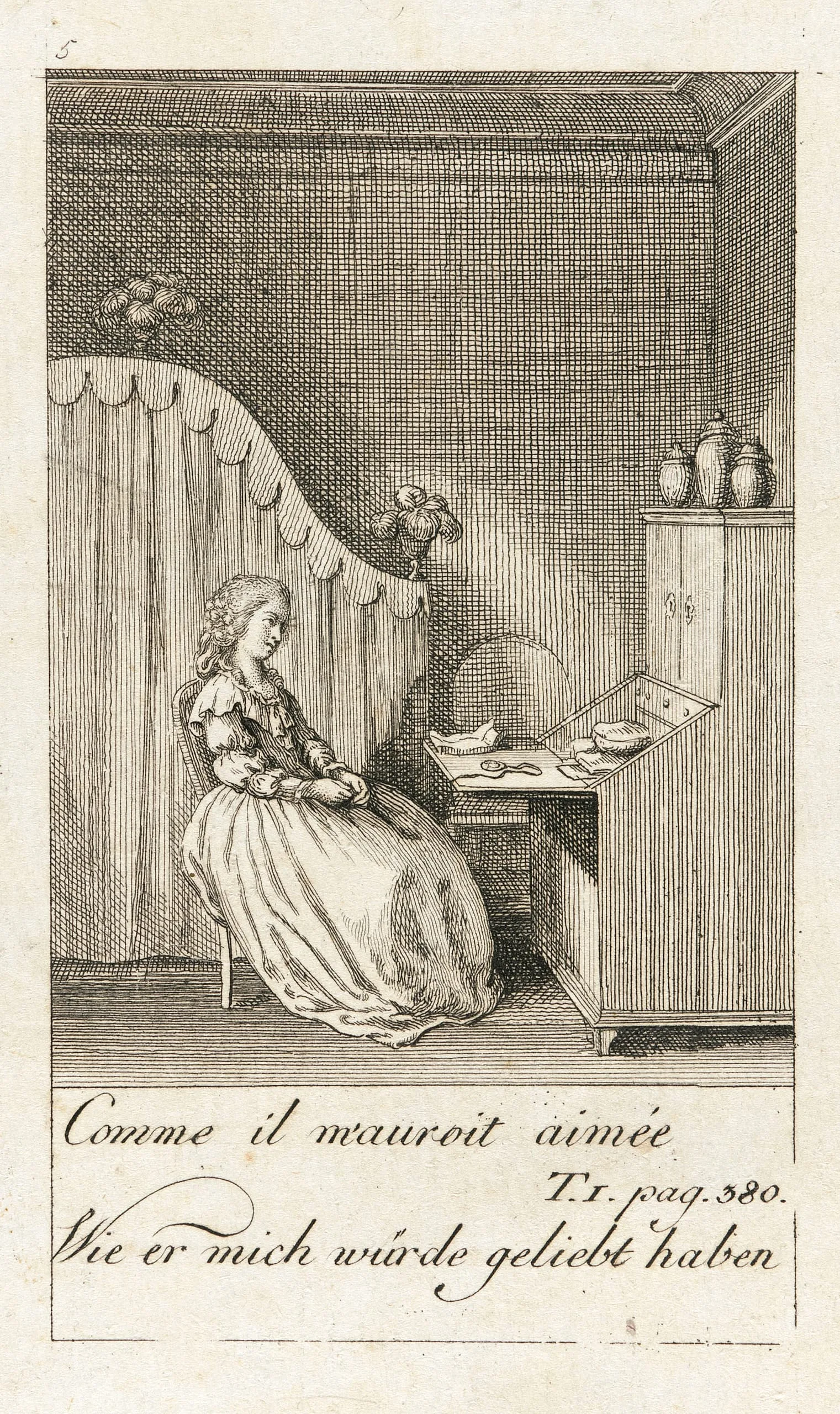 Engraving on cream paper, a young woman in a full-skirted dress sits in profile beside an open writing desk in an interior, with captions in French and German below