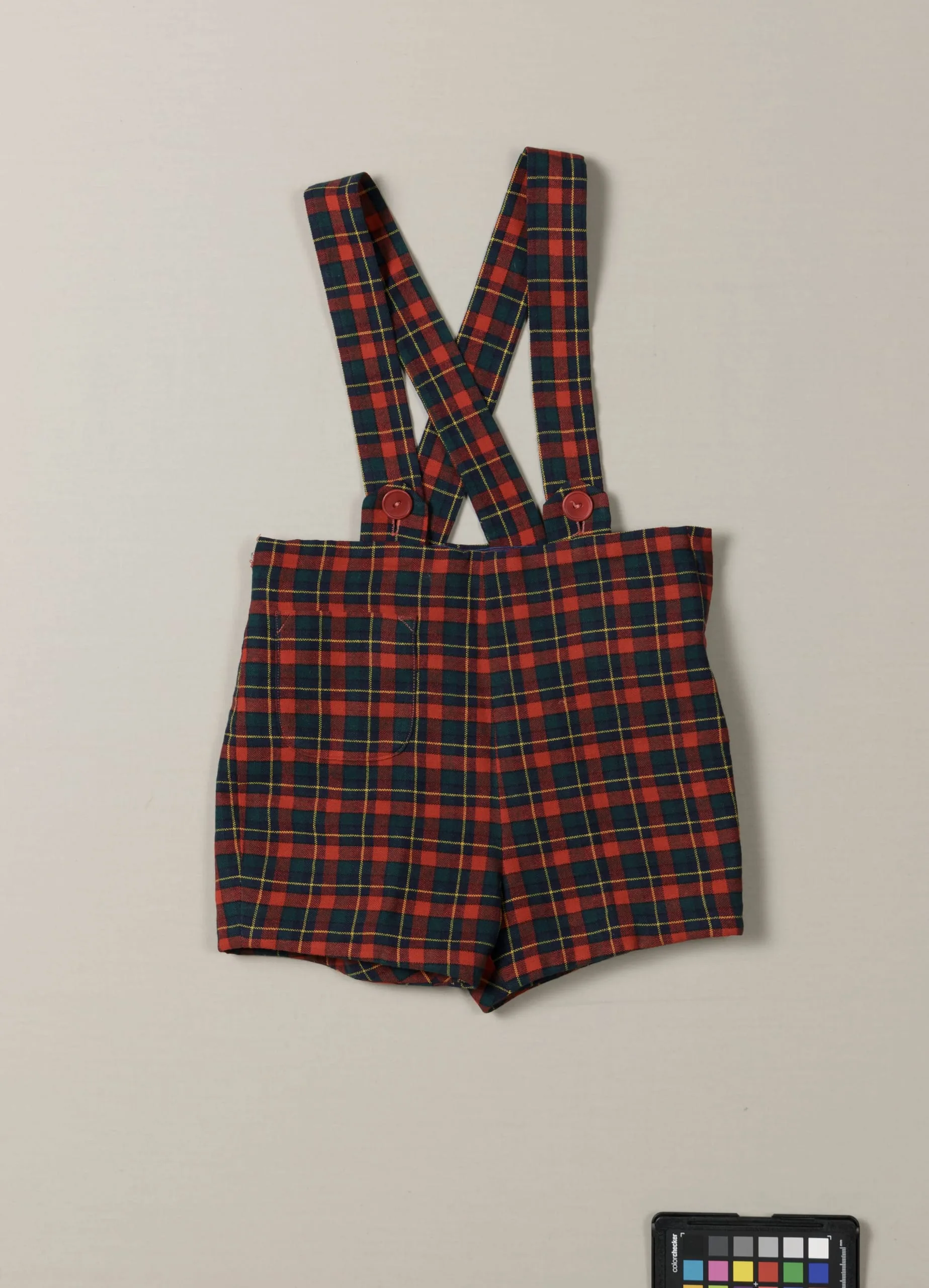 Child's tartan plaid shorts with crossed suspender straps in crimson red and dark teal plaid, fastened with two red buttons at the waistband