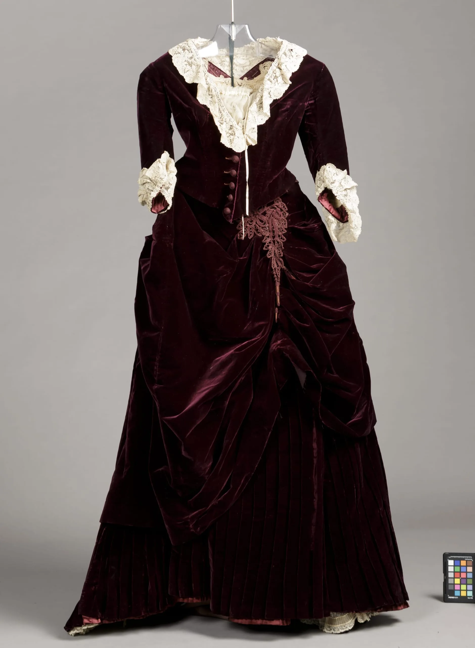 - Bodice: silk velvet with linen bobbin lace and silk tulle trim; Skirt: silk velvet with silk soutache trim
