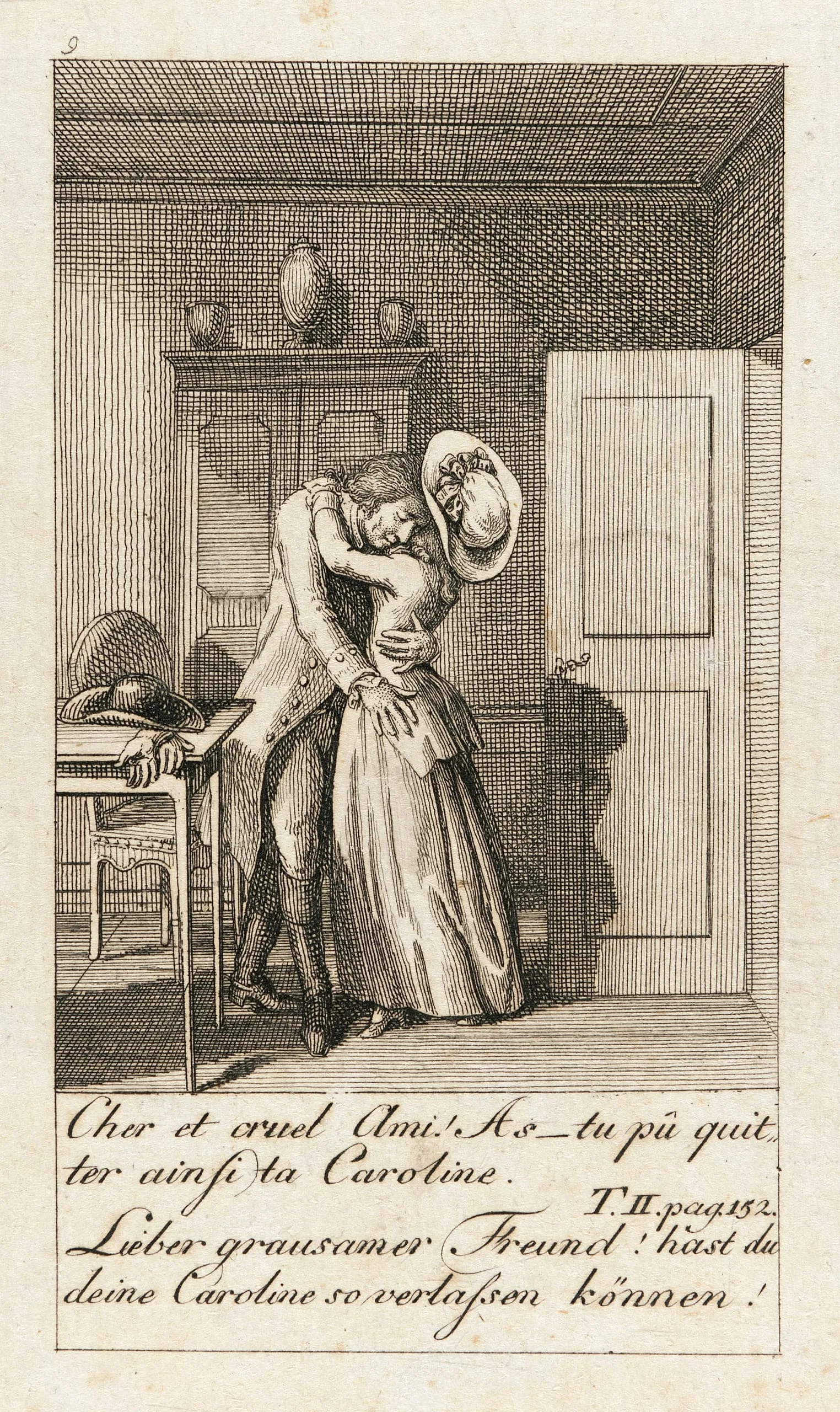 Engraving on cream paper of a man and woman in 18th-century dress embracing in an interior, with French and German text below