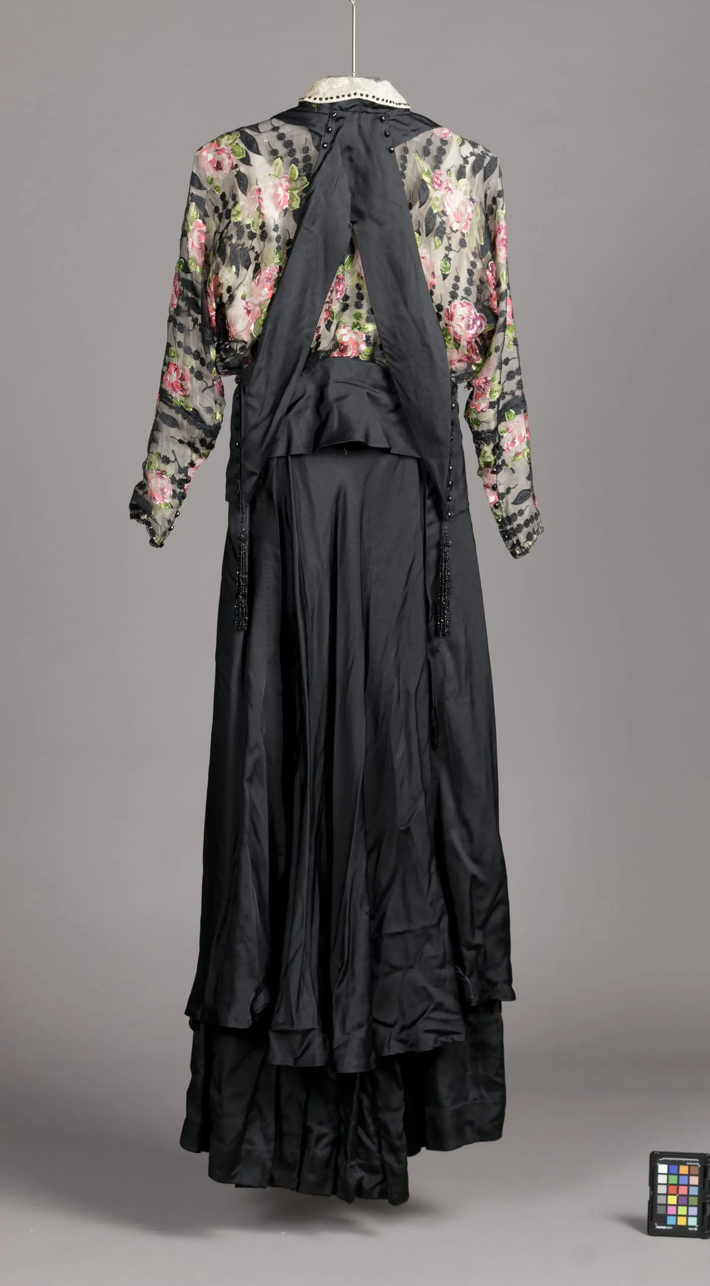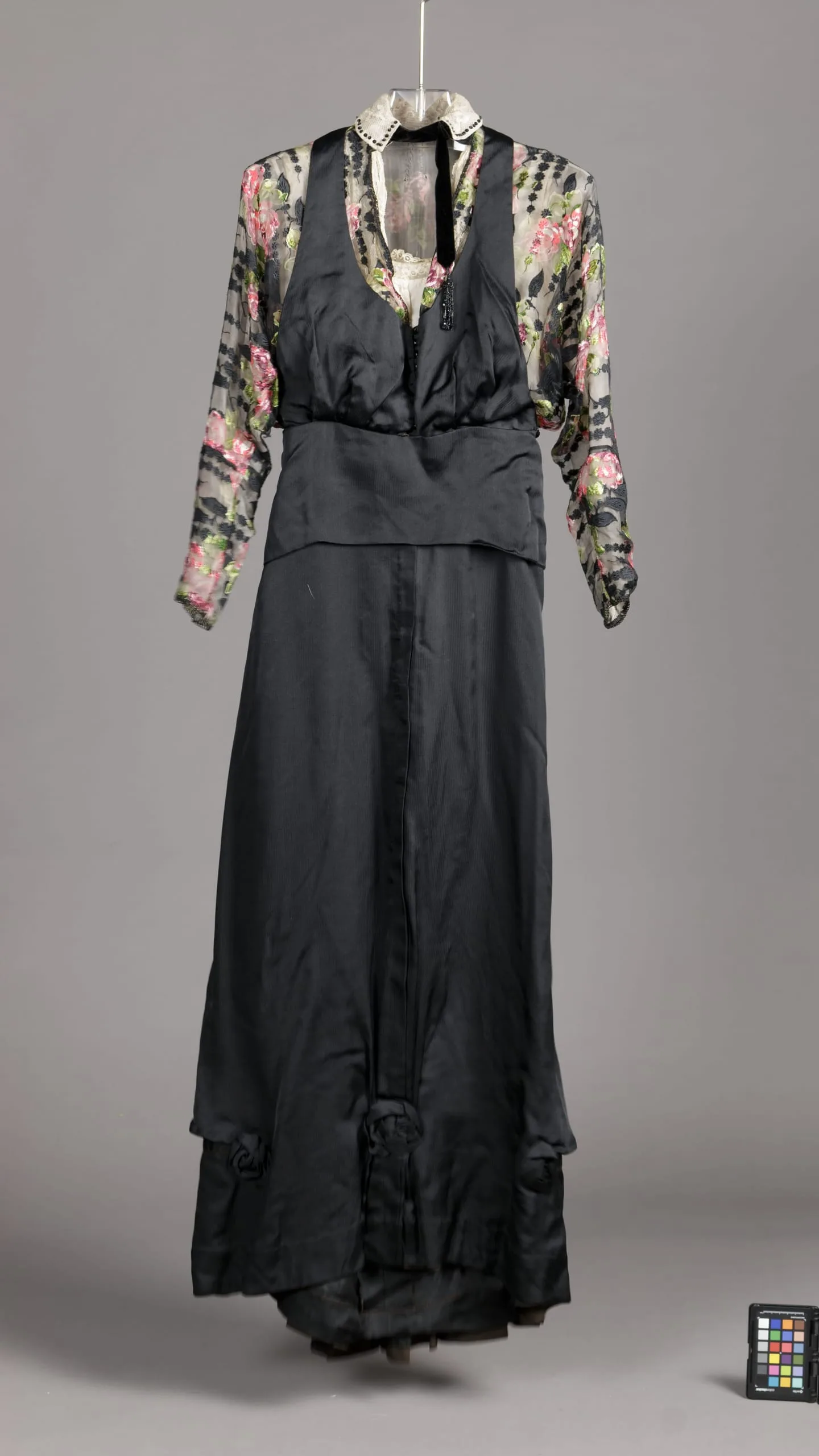 - Silk plain weave and silk plain weave (chiffon) with silk supplementary warp patterning, printed, with cotton and silk lace, metal sequins, glass beads, silk velvet ribbon, and glass bead tassels