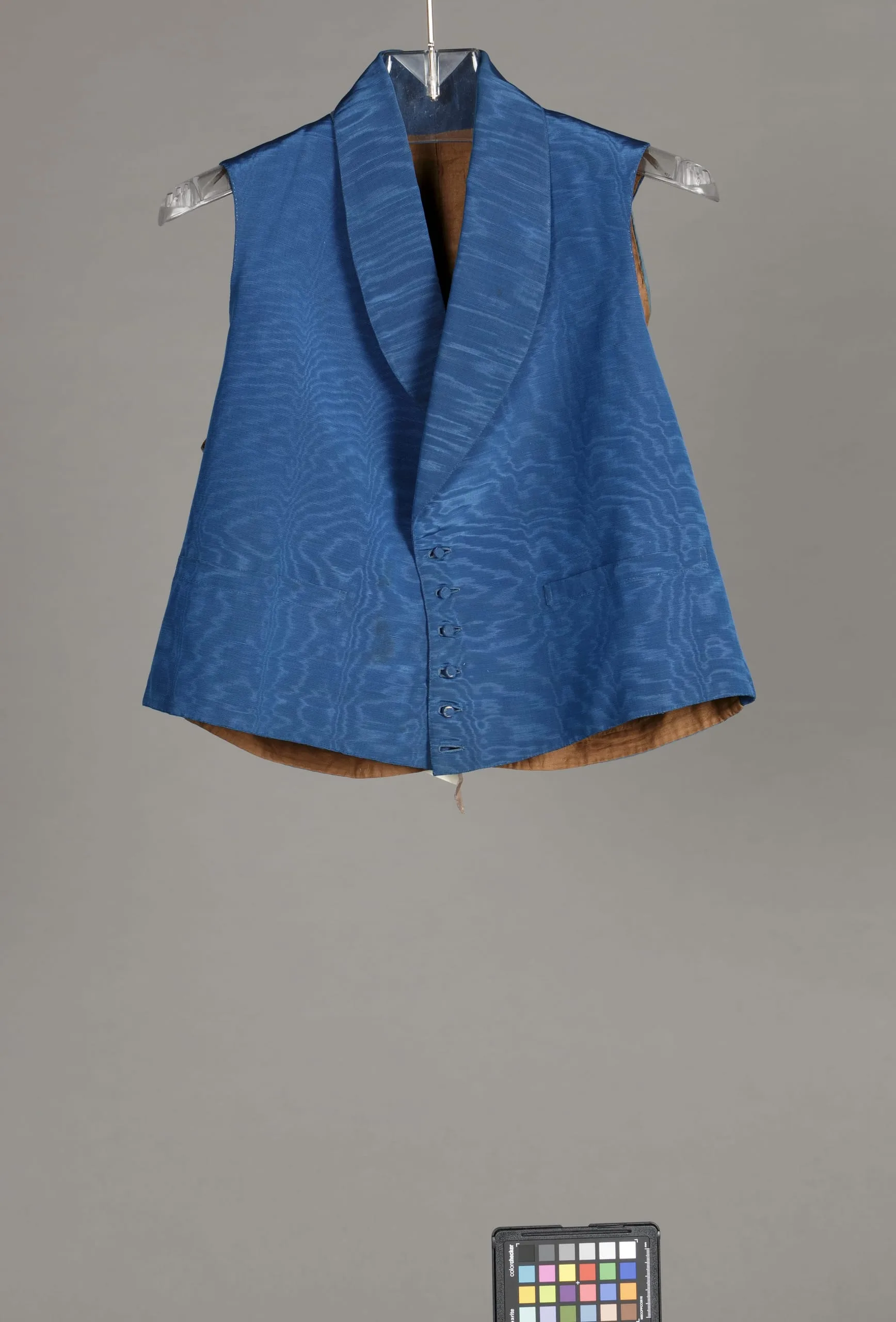 Blue silk moiré waistcoat with shawl collar, seven front buttons, and caramel brown lining, displayed on a clear hanger