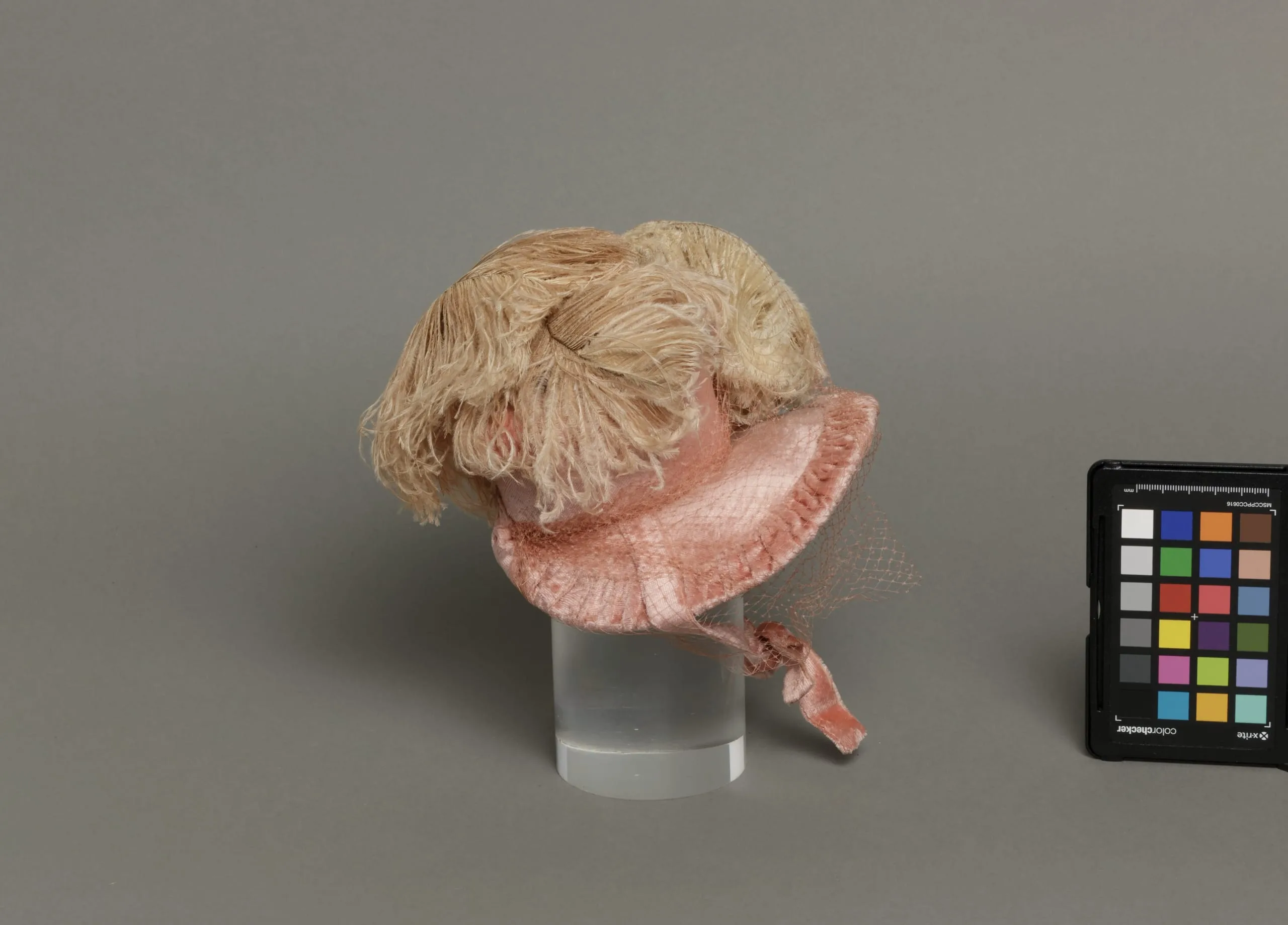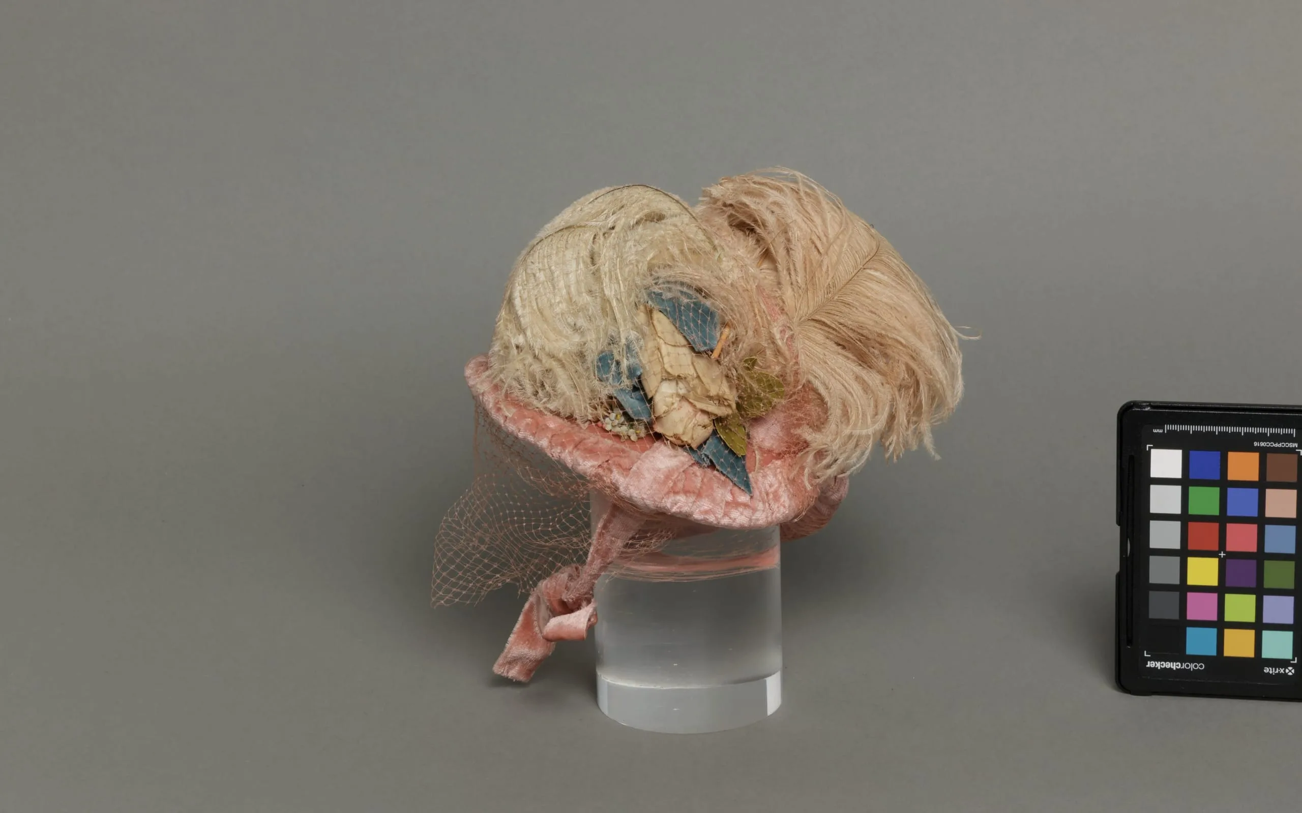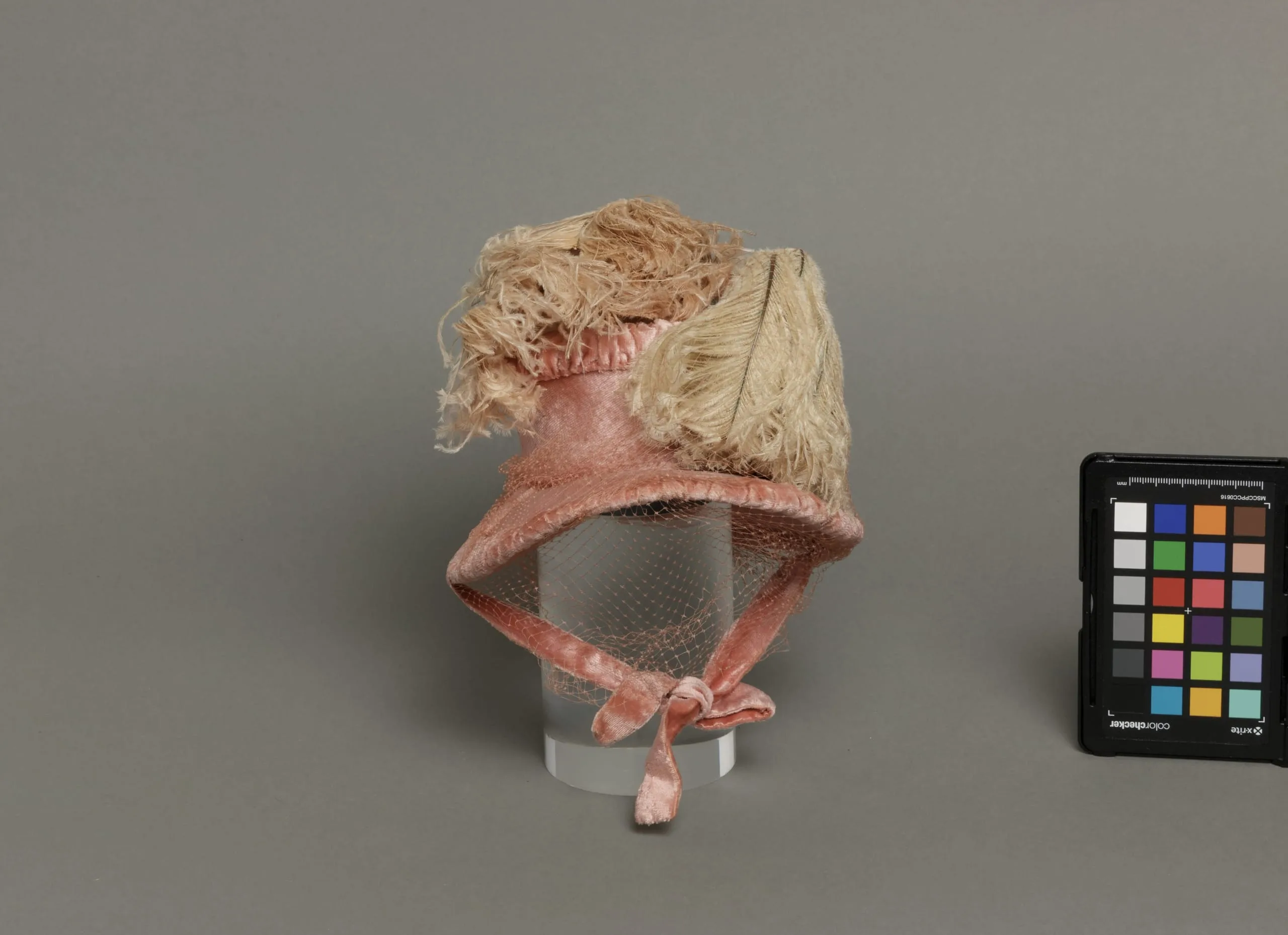 - Silk velvet with silk net, ostrich feathers, and cotton plain weave