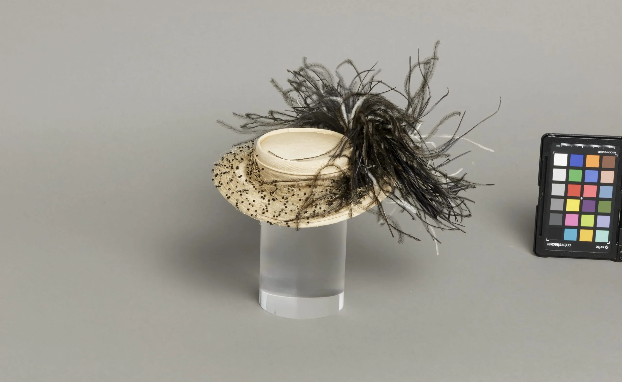 - Silk plain weave (faille) with silk net, and ostrich feathers