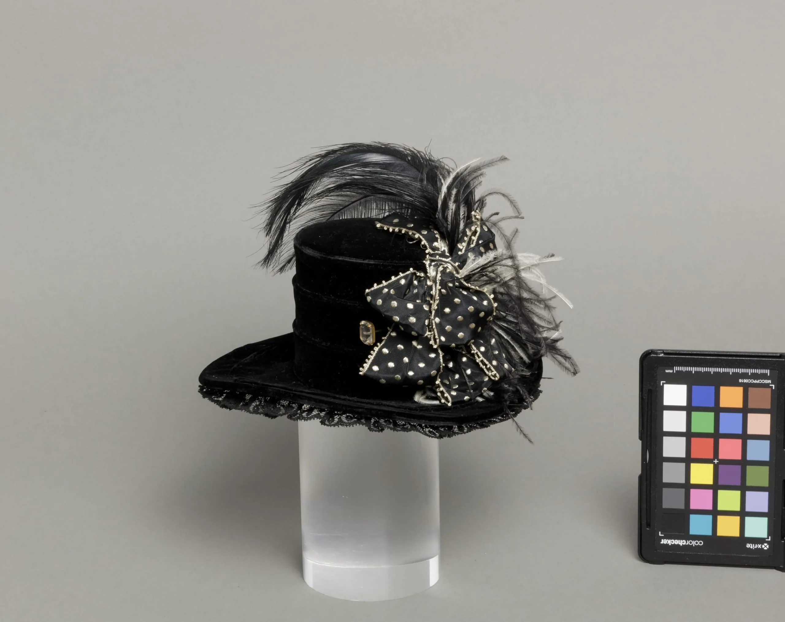 - a) Silk velvet with silk lace, silk plain weave with silk supplementary warp patterned ribbon with ostrich feather and vulture feather b) Metal and crystal