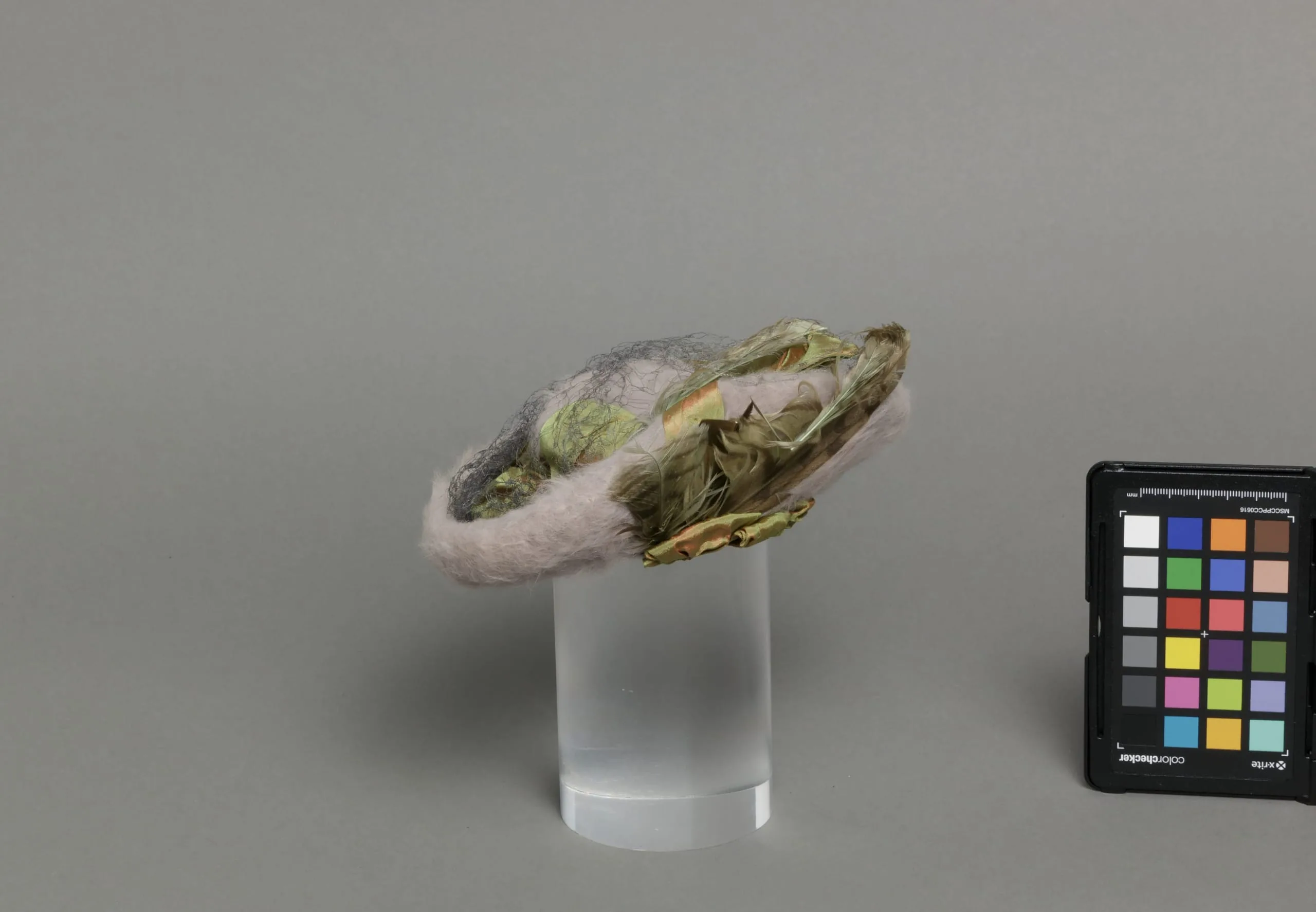 - Fur felt with silk net, silk plain weave (taffeta) and feathers