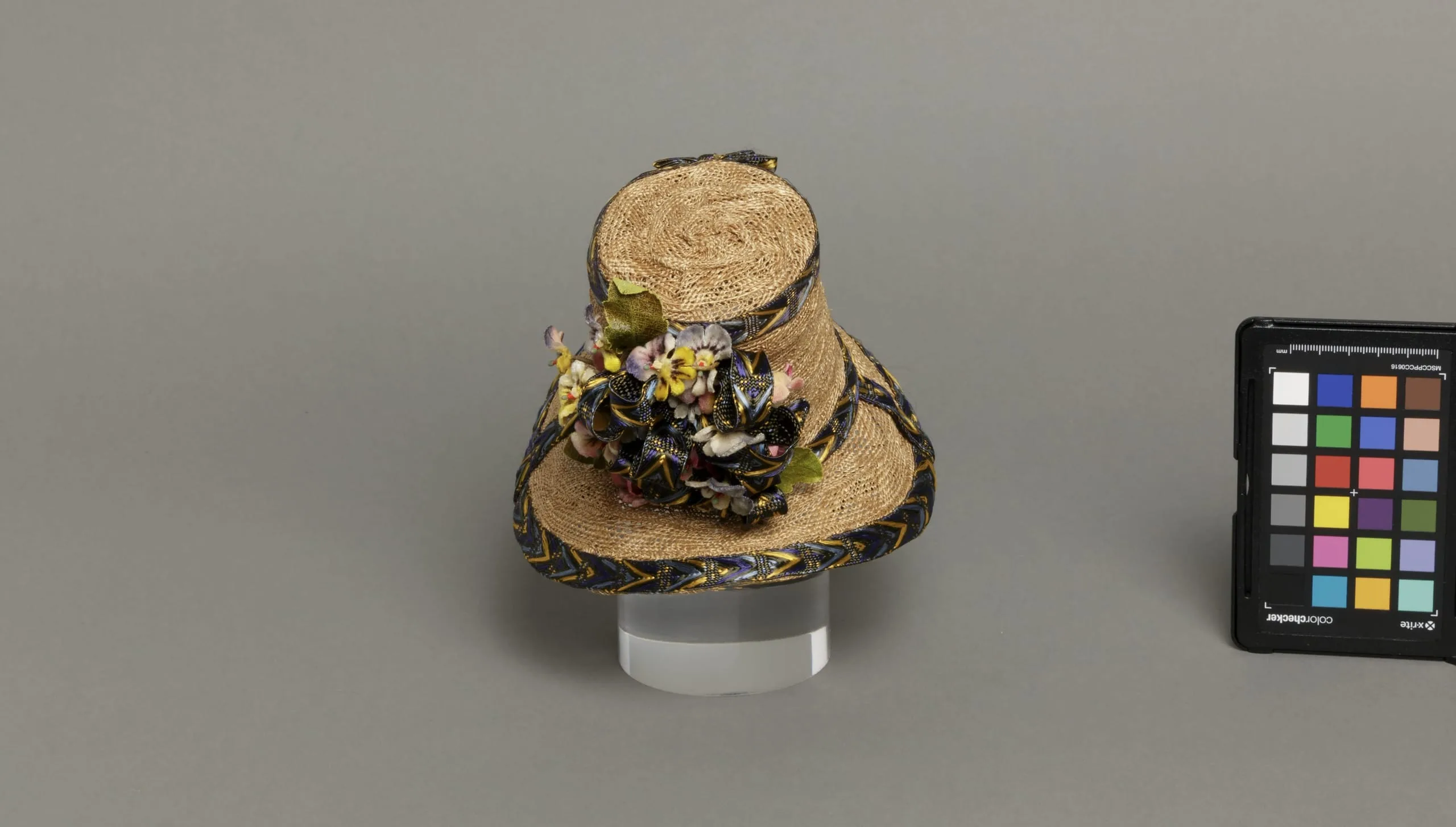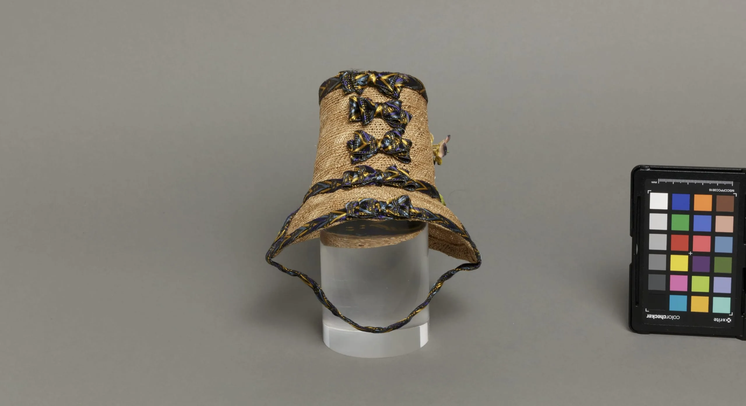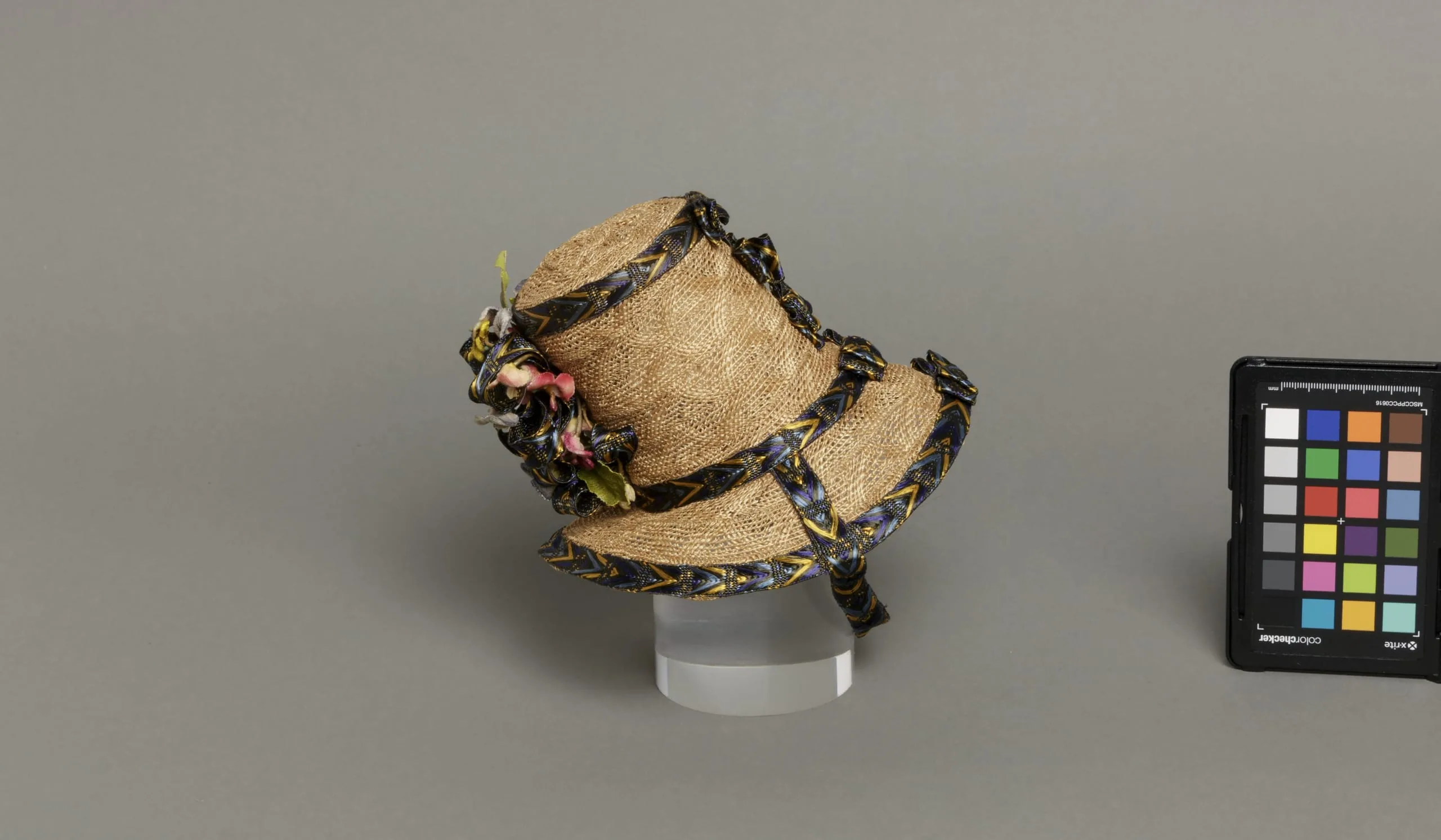 - Straw, plaited, silk passementerie and silk velvet, painted