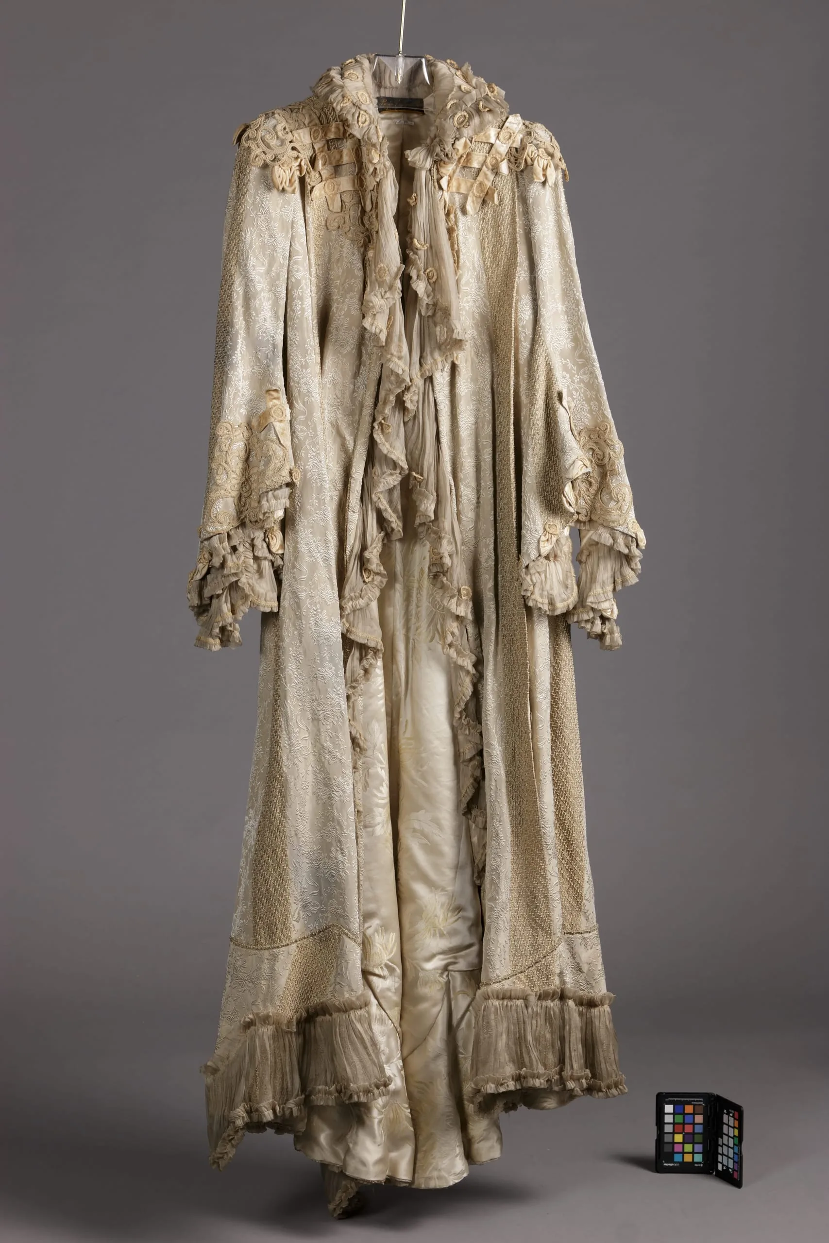 - Silk and metallic-wrapped thread plain weave with silk supplementary warp patterning and self weft-float patterning with silk plain weave (crepe chiffon), linen lace, silk and metallic-thread cord, silk velvet, and silk satin ribbon.