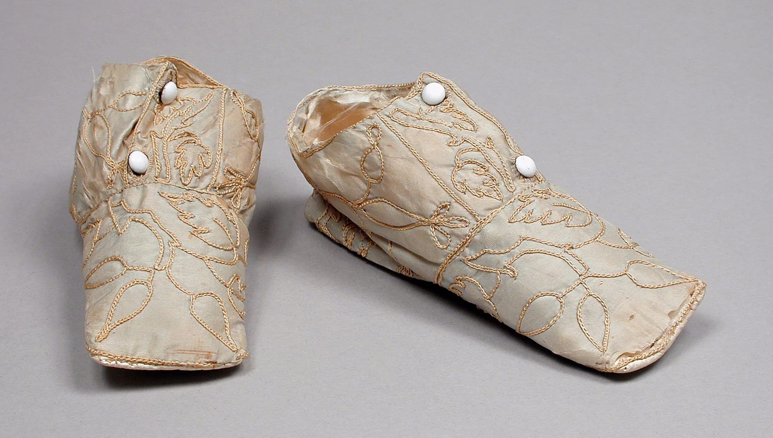 - Silk plain weave (taffeta), with silk embroidery, metal buttons, and leather