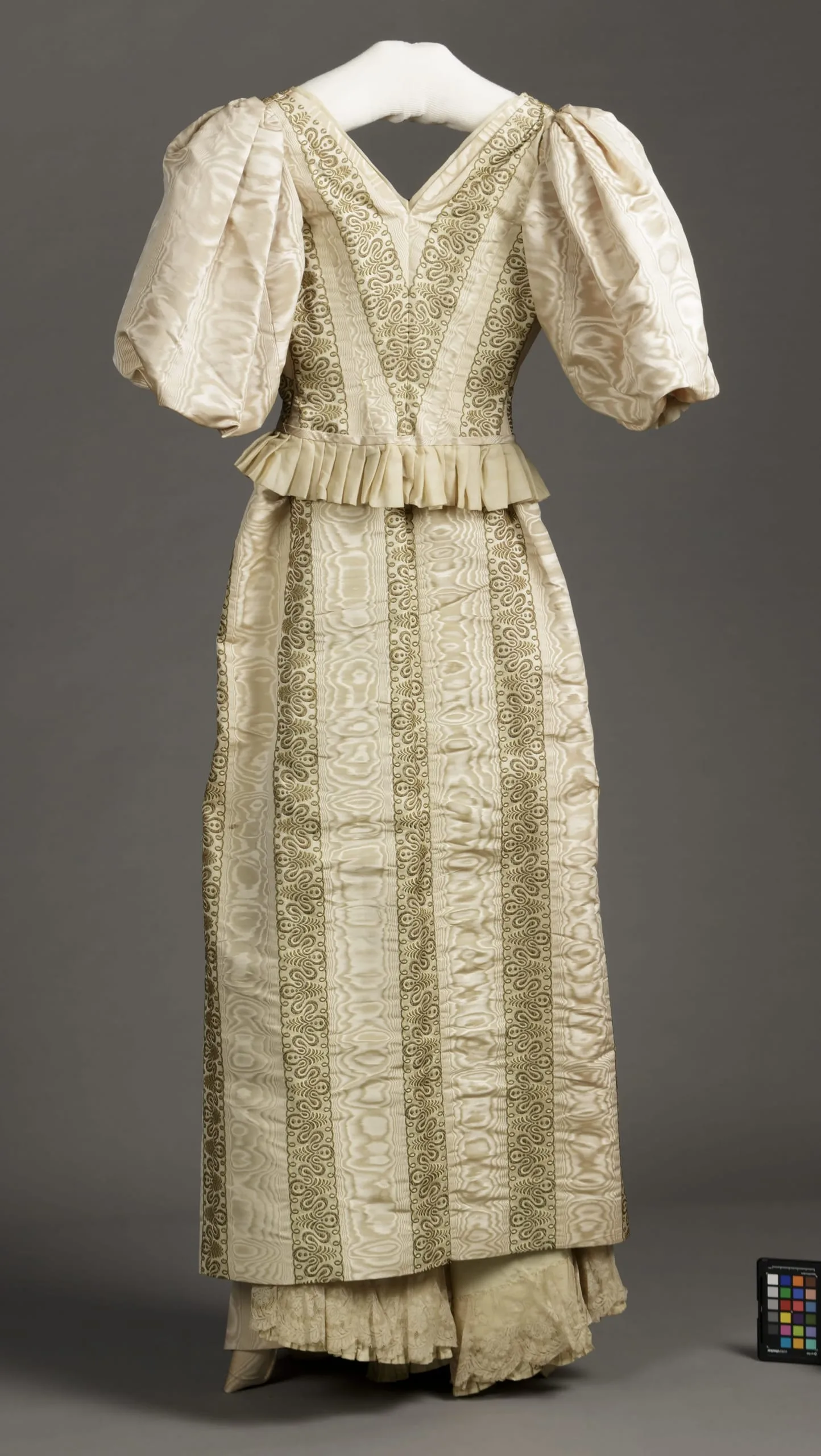 b) Silk plain weave (faille), moiré, silk plain weave (faille), moire with silk twill with supplementary metallic thread warp and silk weft patterning with linen lace